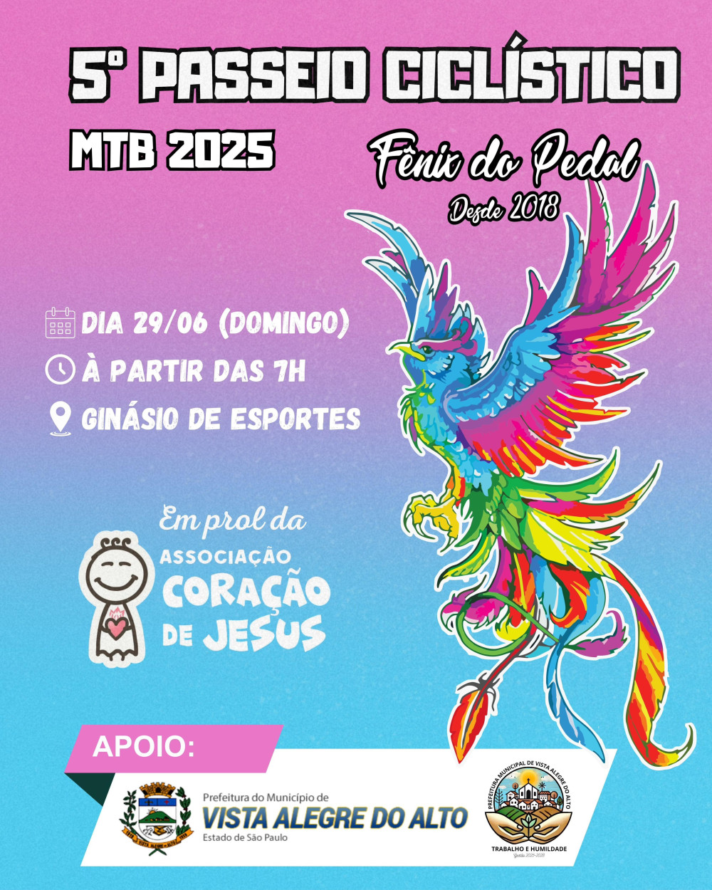 A cidade de Vista Alegre do Alto será palco, no próximo dia 29 de junho, de um dos eventos mais esperados pelos amantes do ciclismo e da solidariedade: o 5º Passeio Ciclístico MTB Fênix do Pedal. Promovido com o apoio da Prefeitura Municipal, o encontro acontece a partir das 7h, com concentração no Ginásio de Esportes, e promete reunir ciclistas de todas as idades e níveis de preparo físico.