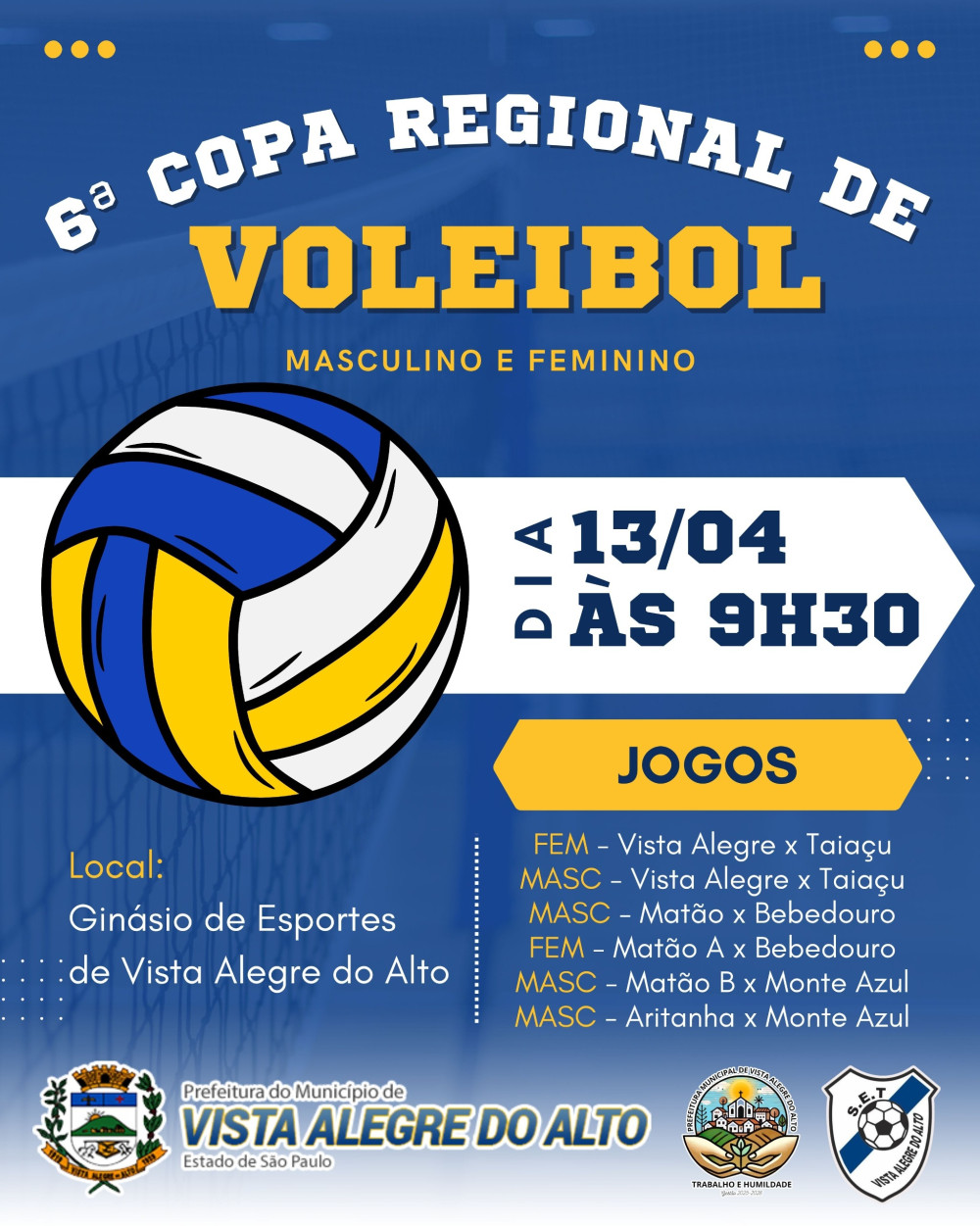 A estreia das equipes de Vista Alegre será neste domingo, dia 13/04, a partir das 9h30. Nossos atletas entram em quadra com garra e dedicação, representando com orgulho a cidade em mais essa grande competição regional!