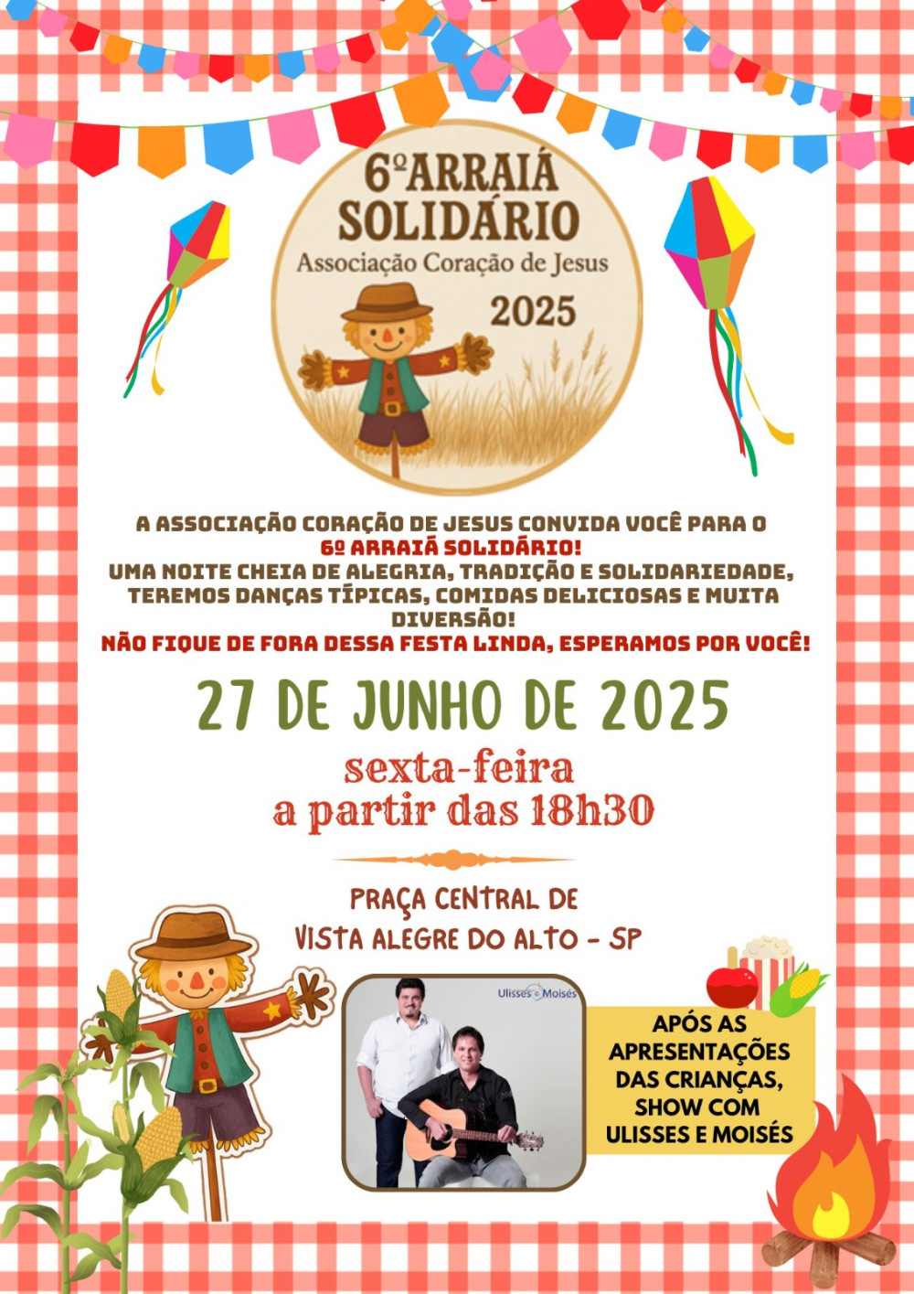 Na sexta-feira, 27 de junho de 2025, a Praça Central de Vista Alegre do Alto será palco de uma noite especial com a realização do 6º Arraiá Solidário, promovido pela Associação Coração de Jesus.
