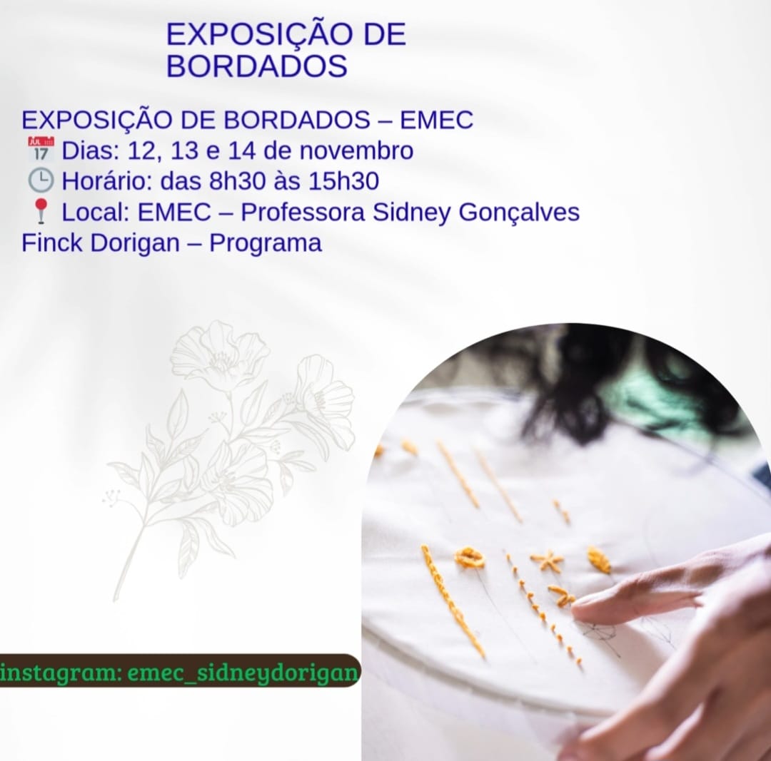 Os alunos do Projeto de Bordado, sob orientação da professora Soninha Simão, realizaram de 12 a 14 de novembro uma exposição especial na EMEC Profa. Sidney Gonçalves Fink Dorigan. A mostra reuniu trabalhos produzidos durante as aulas e chamou a atenção pela delicadeza, criatividade e dedicação dos participantes.