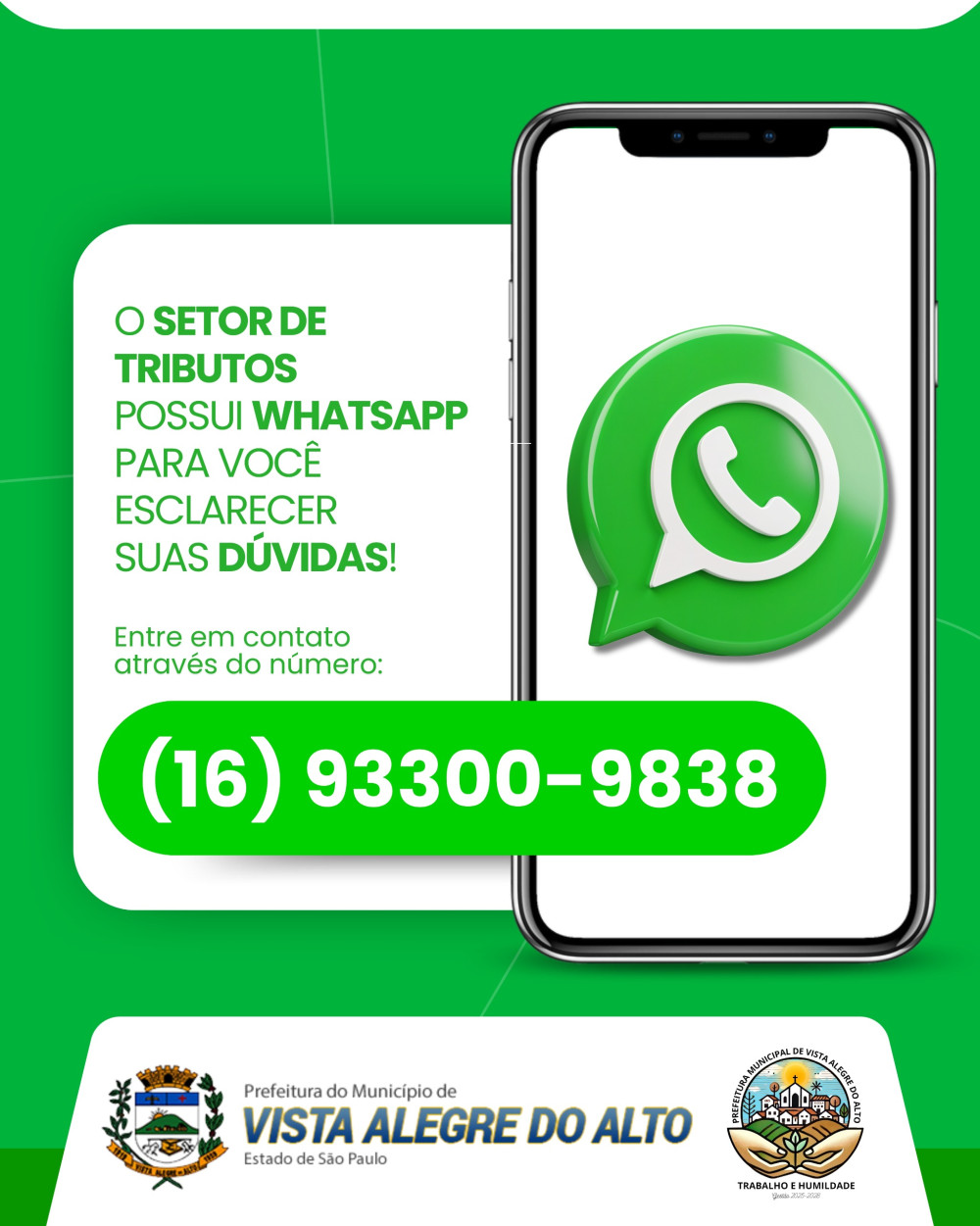 O Setor de Tributos da Prefeitura de Vista Alegre do Alto agora conta com atendimento via WhatsApp!