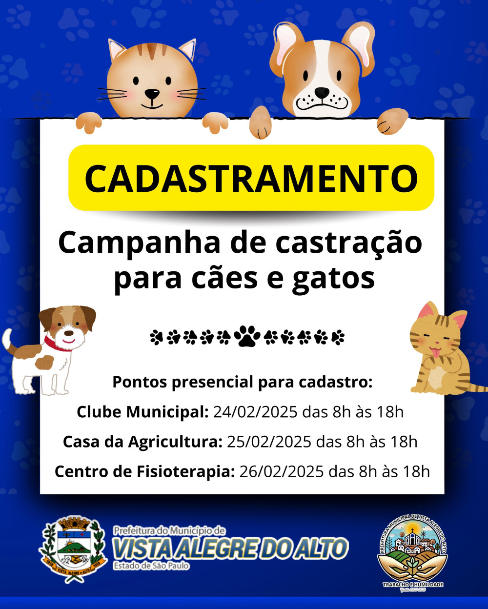 A Prefeitura Municipal de Vista Alegre do Alto estará realizando, por meio de um questionário, o cadastramento dos animais da cidade para dar início ao programa de castração previsto para o ano de 2025.