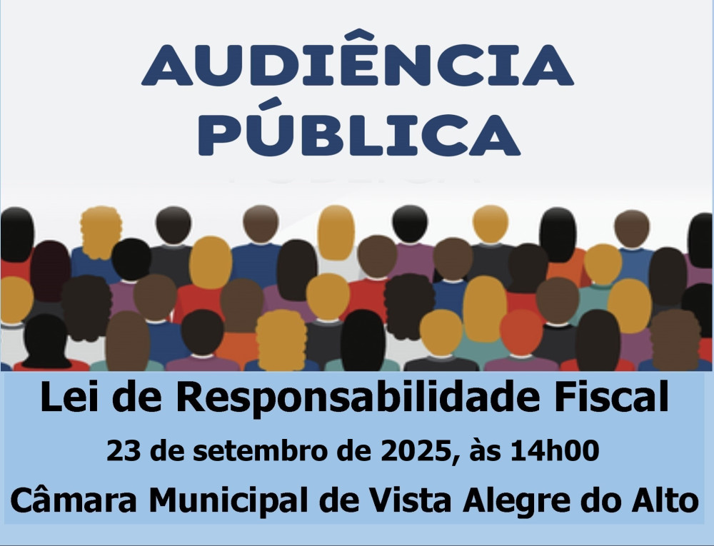 COMUNICO que será realizada, às 14h00 do dia 23 de setembro de 2025, na Sala de Sessões da Câmara Municipal de Vista Alegre do Alto, uma Audiência Pública para demonstração e avaliação do cumprimento das metas fiscais do 2º quadrimestre de 2025.