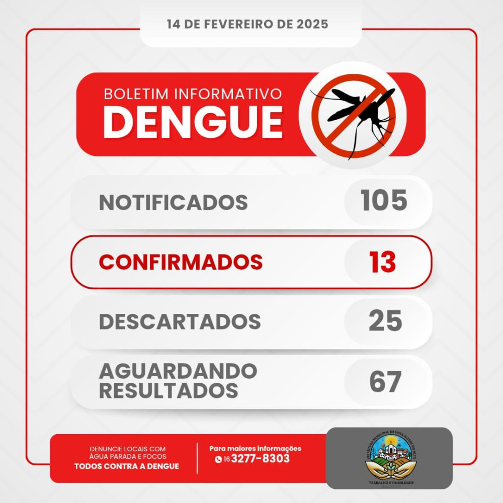 A Secretaria de Saúde de Vista Alegre do Alto divulgou novos dados sobre os casos de dengue no município. Até o dia 14 de fevereiro de 2025, foram registrados: