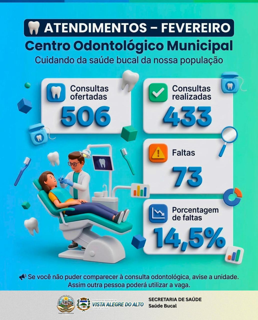 A Prefeitura Municipal de Vista Alegre do Alto, por meio da Secretaria de Saúde, divulgou o balanço dos atendimentos realizados no Centro Odontológico Municipal durante o mês de fevereiro.