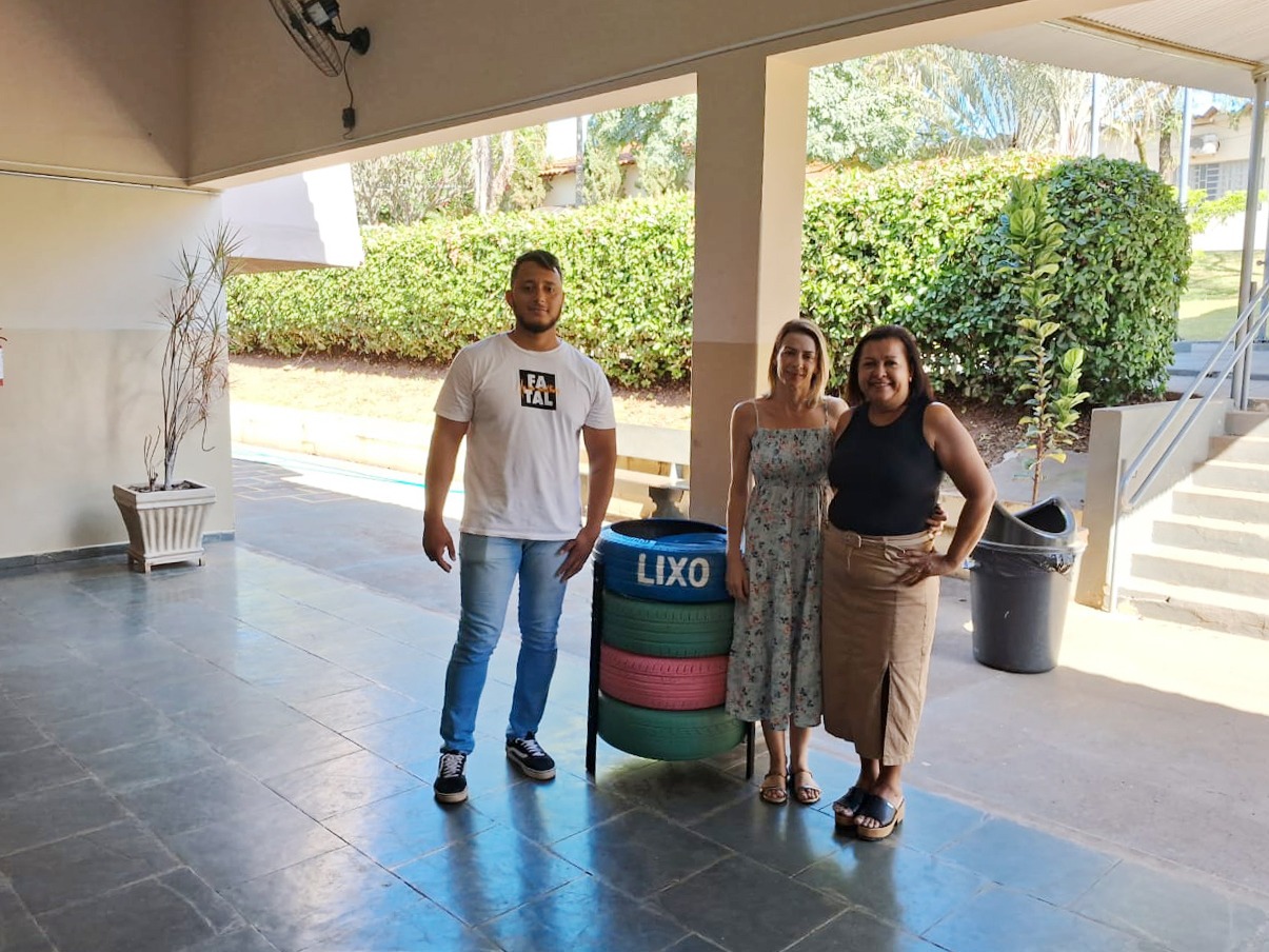 Na imagem, a equipe da Vigilância Sanitária e da Saúde apresenta uma das lixeiras confeccionadas que está na escola EMEI Irinei Julião, mostrando o resultado desse trabalho coletivo em prol da comunidade.