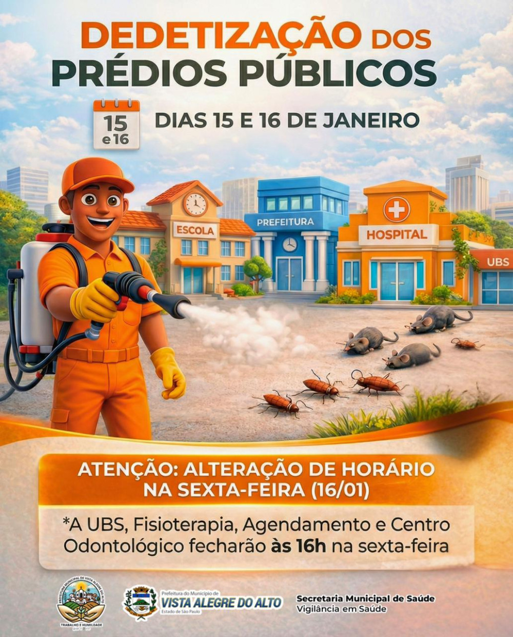 A Prefeitura de Vista Alegre do Alto informa que será realizada a dedetização dos prédios públicos do município nos dias 15 e 16 de janeiro, como parte das ações de prevenção e cuidado com a saúde da população e dos servidores.