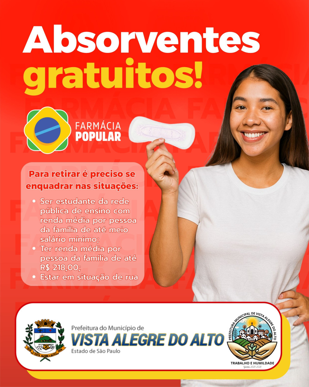 A Prefeitura de Vista Alegre do Alto informa que já está disponível a distribuição gratuita de absorventes por meio da Farmácia Popular, destinado a pessoas que se encontram em situação de vulnerabilidade social.