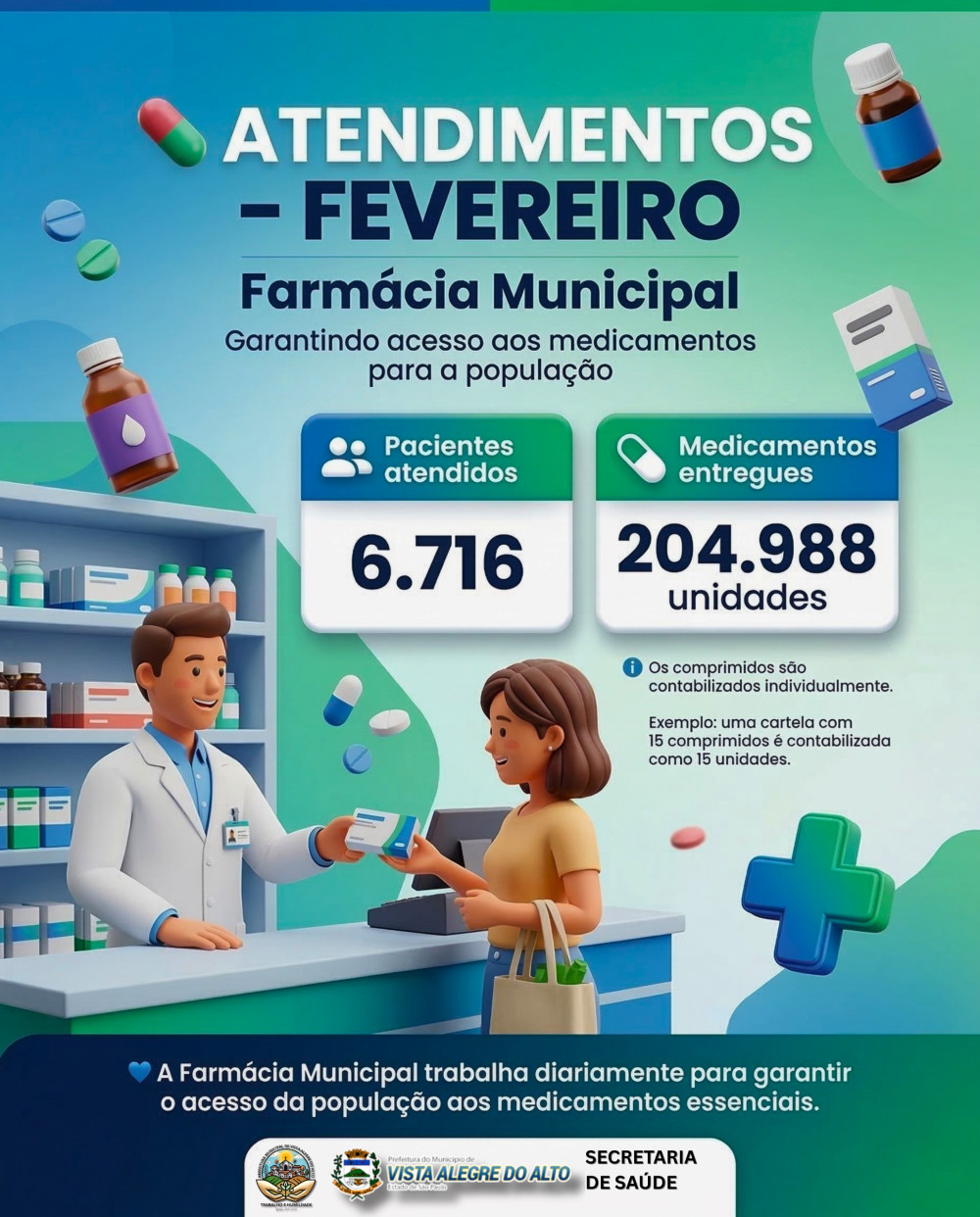 A Prefeitura de Vista Alegre do Alto, por meio da Secretaria Municipal de Saúde, divulgou os números de atendimentos realizados pela Farmácia Municipal durante o mês de fevereiro.