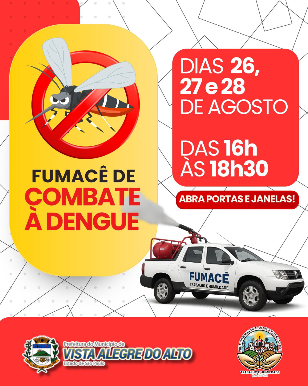 Nos dias 26, 27 e 28 de agosto, a Prefeitura de Vista Alegre do Alto, por meio da Secretaria Municipal de Saúde e da Vigilância em Saúde, realizará a aplicação do Fumacê para combate ao mosquito transmissor da dengue.
