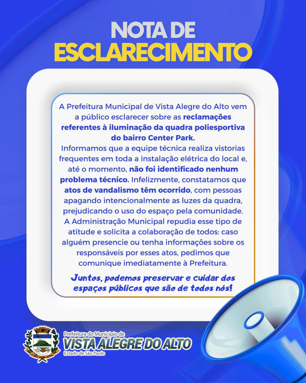 A Prefeitura Municipal de Vista Alegre do Alto vem a público esclarecer sobre as reclamações referentes à iluminação da quadra poliesportiva do campo do bairro Center Park.