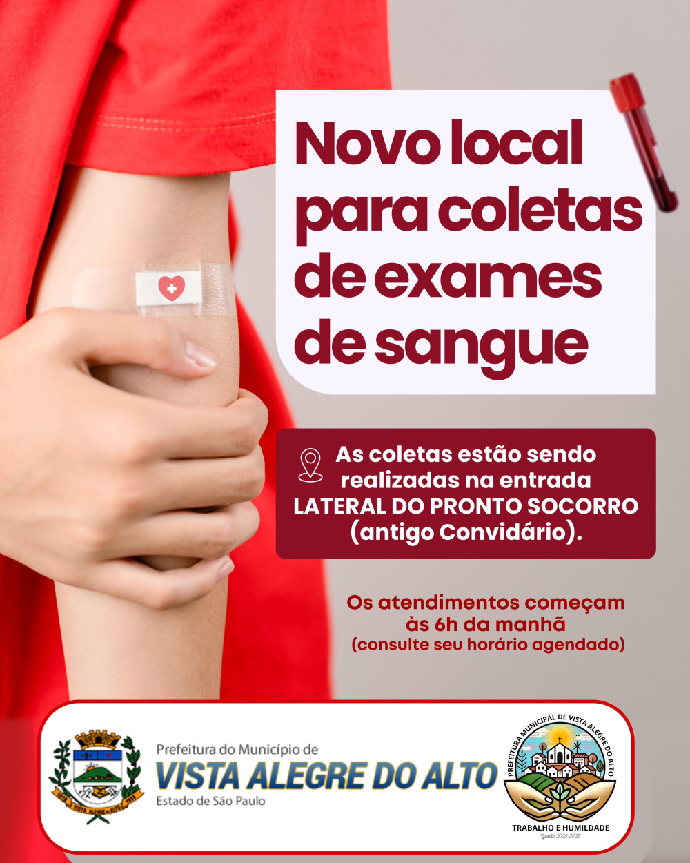 A Prefeitura de Vista Alegre do Alto, por meio da Secretaria Municipal de Saúde, reforça que as coletas de exames de sangue já estão sendo realizadas em novo endereço.