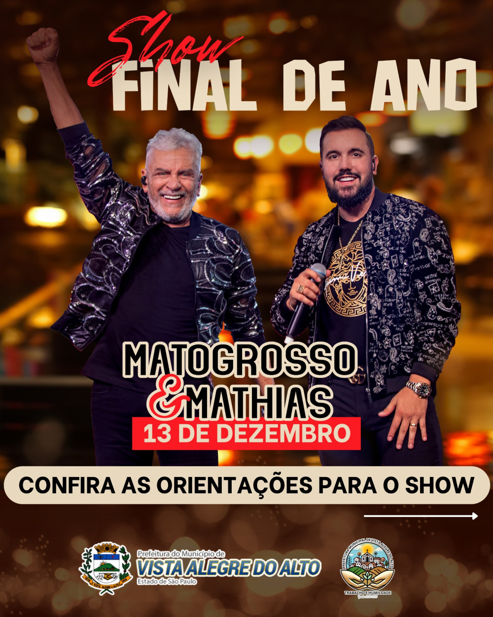 A Prefeitura de Vista Alegre do Alto informa as orientações oficiais para o grande show gratuito de Matogrosso & Mathias, que será realizado no dia 13 de dezembro, às 22h, na Praça Central.
