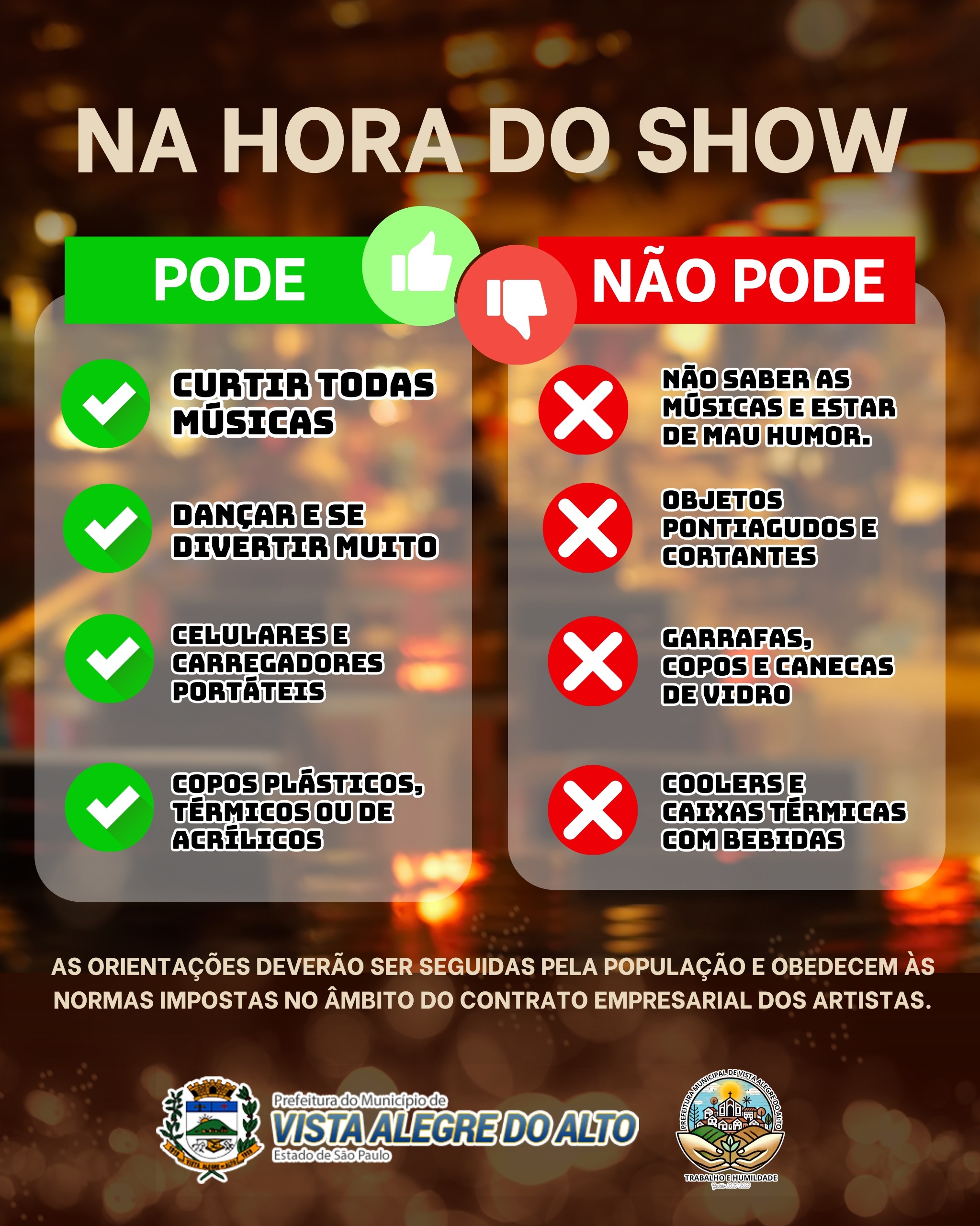 As orientações seguem as normas previstas no contrato empresarial dos artistas e devem ser respeitadas por todos os participantes.