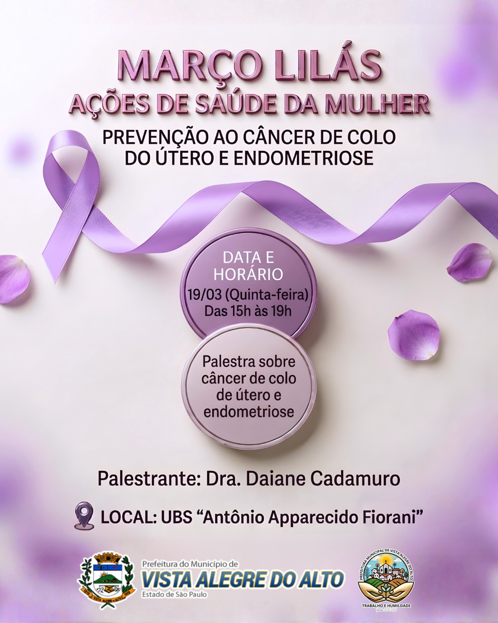 A Prefeitura de Vista Alegre do Alto promove, neste mês, uma importante ação voltada à saúde da mulher, dentro da campanha “Março Lilás”. A iniciativa tem como foco a conscientização e prevenção do câncer de colo do útero, além de abordar a endometriose, temas fundamentais para a saúde feminina.