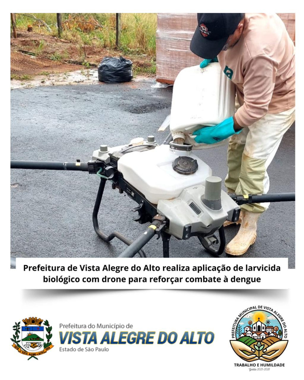 Na manhã desta quinta-feira, a Prefeitura de Vista Alegre do Alto, por meio da Vigilância em Saúde, realizou uma ação de aplicação de larvicida biológico com o uso de drone no entorno do município. A iniciativa integra as estratégias de prevenção e combate à dengue, buscando reduzir a proliferação do mosquito Aedes aegypti em áreas de difícil acesso.