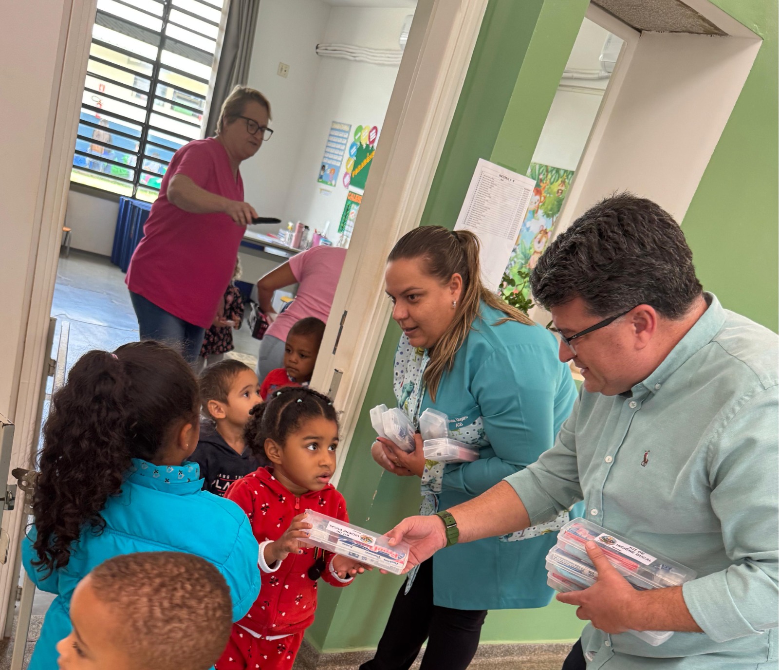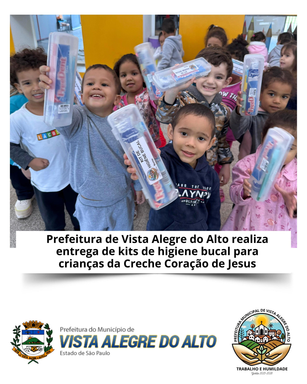Nesta semana, a equipe de Saúde Bucal de Vista Alegre do Alto realizou mais uma importante ação de prevenção e cuidado com os pequenos. As odontopediatras Dra. Tássia e Dra. Fernanda, acompanhadas pelo coordenador de Saúde Bucal, Dr. Evandro, e pelas auxiliares Bruna e Eduarda, estiveram na Creche Coração de Jesus para a entrega de kits de higiene bucal às crianças do maternal que já estão em idade de escovação ou que iniciam os primeiros cuidados com a saúde da boca.