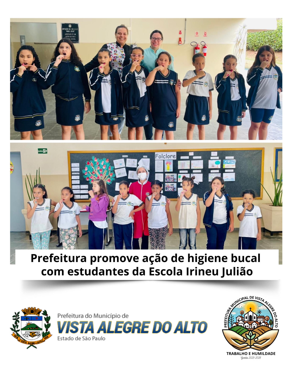 A Prefeitura de Vista Alegre do Alto, por meio da Secretaria Municipal de Saúde, promoveu mais uma edição da atividade coletiva de orientação em grupo e escovação supervisionada com os alunos da Escola Irineu Julião, envolvendo crianças do 1º ao 5º ano da Educação Infantil.