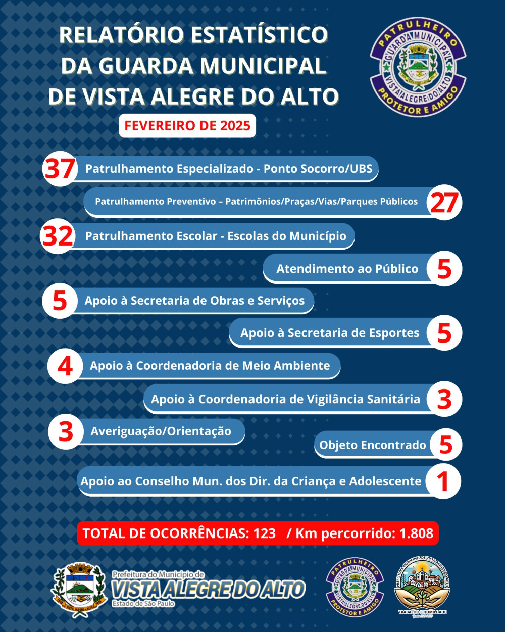 A Guarda Municipal de Vista Alegre do Alto segue atuando de forma ativa para garantir a segurança e o bem-estar da população. No mês de fevereiro de 2025, foram registradas 123 ocorrências, destacando-se as seguintes ações conforme descrição na imagem.