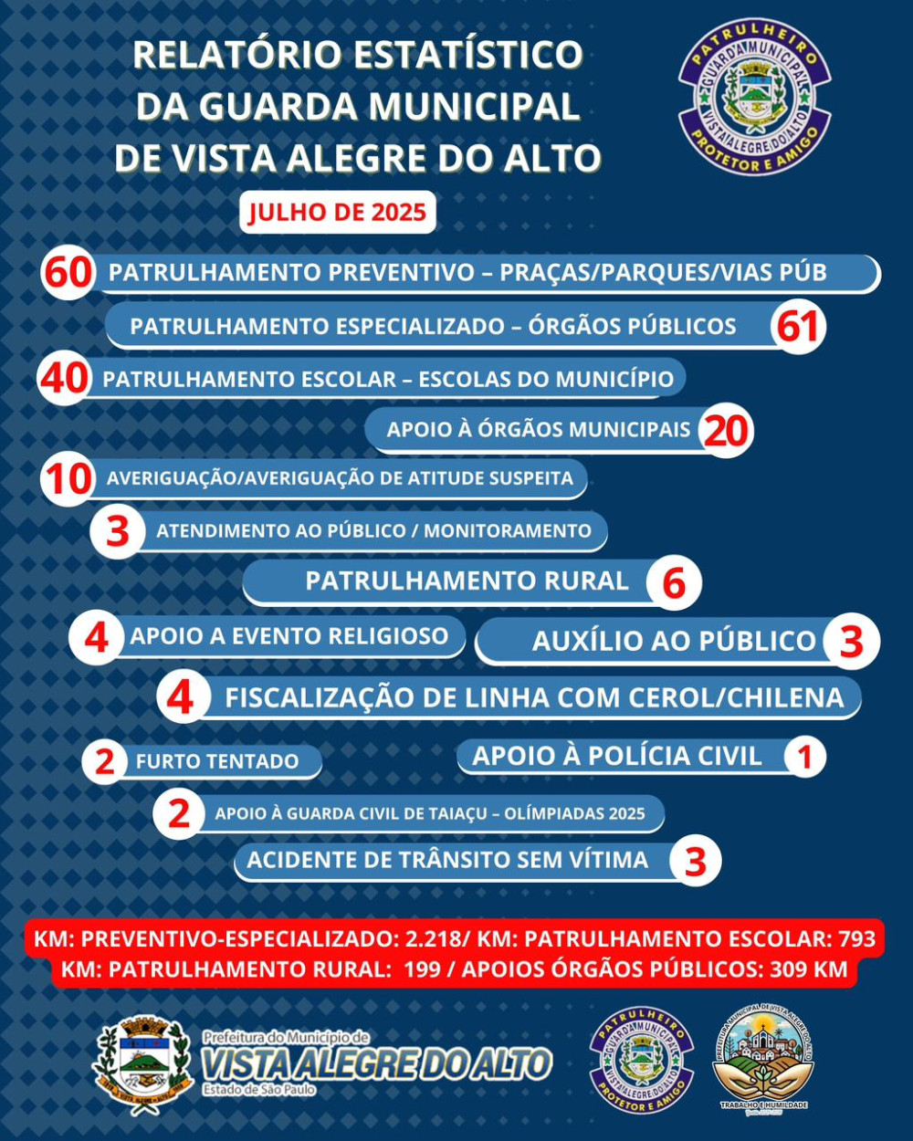 A Guarda Municipal de Vista Alegre do Alto encerrou o mês de julho com 217 ocorrências atendidas em diferentes frentes de atuação, reforçando o compromisso com a segurança e o bem-estar da população.