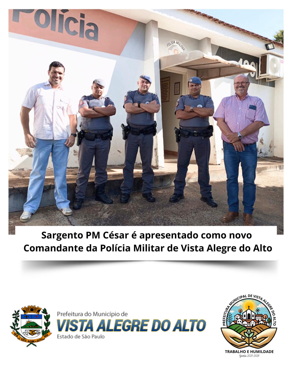 Nesta segunda-feira, 10, o 2º Sargento PM César foi apresentado como o novo comandante da Polícia Militar em nosso município. Ele assumirá a função de forma efetiva, reforçando a segurança e o compromisso com a população de Vista Alegre do Alto.