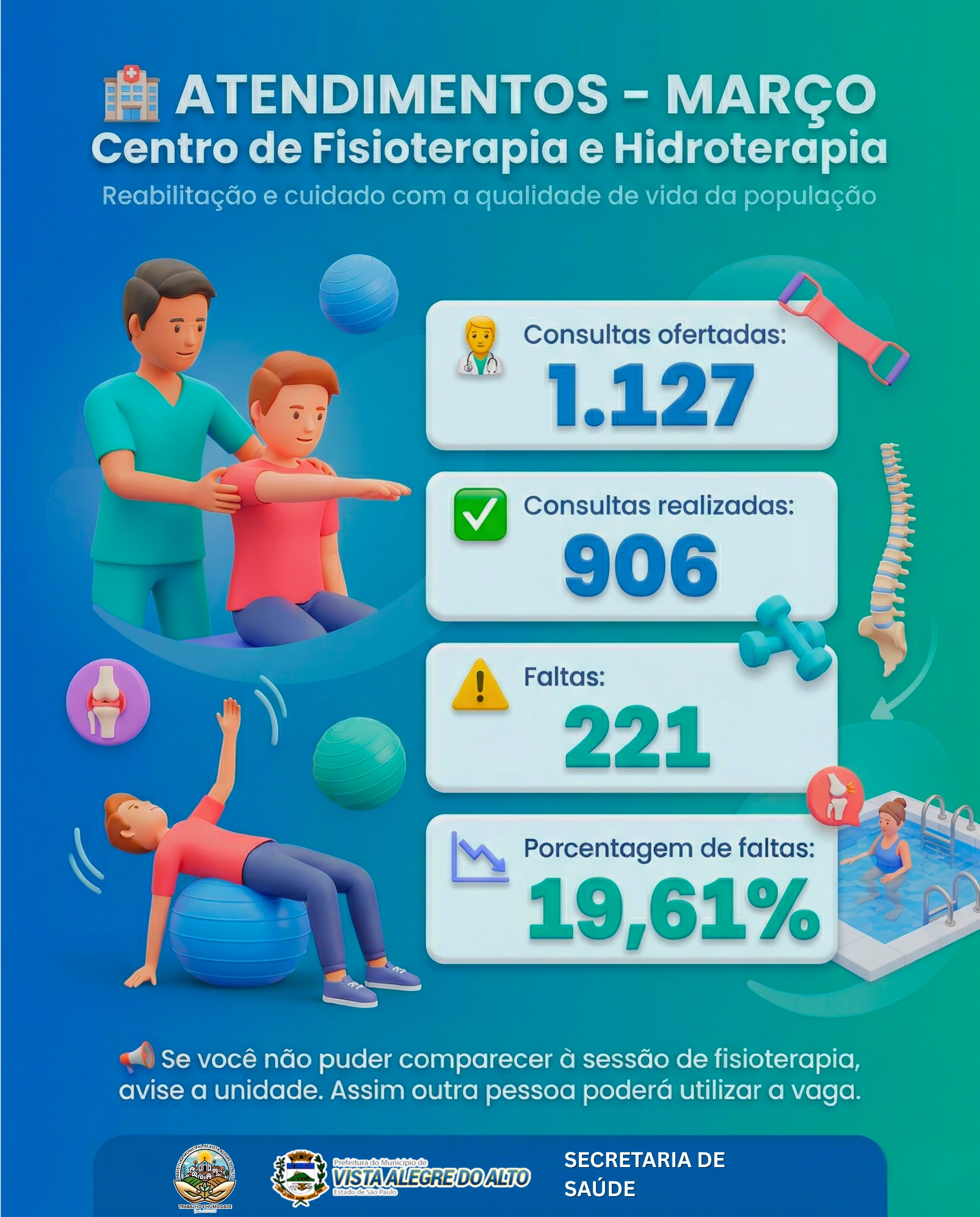Já o Centro de Fisioterapia e Hidroterapia ofertou 1.127 consultas, com 906 atendimentos realizados. O número de faltas foi de 221, representando 19,61%, o que reforça a necessidade de conscientização da população.
