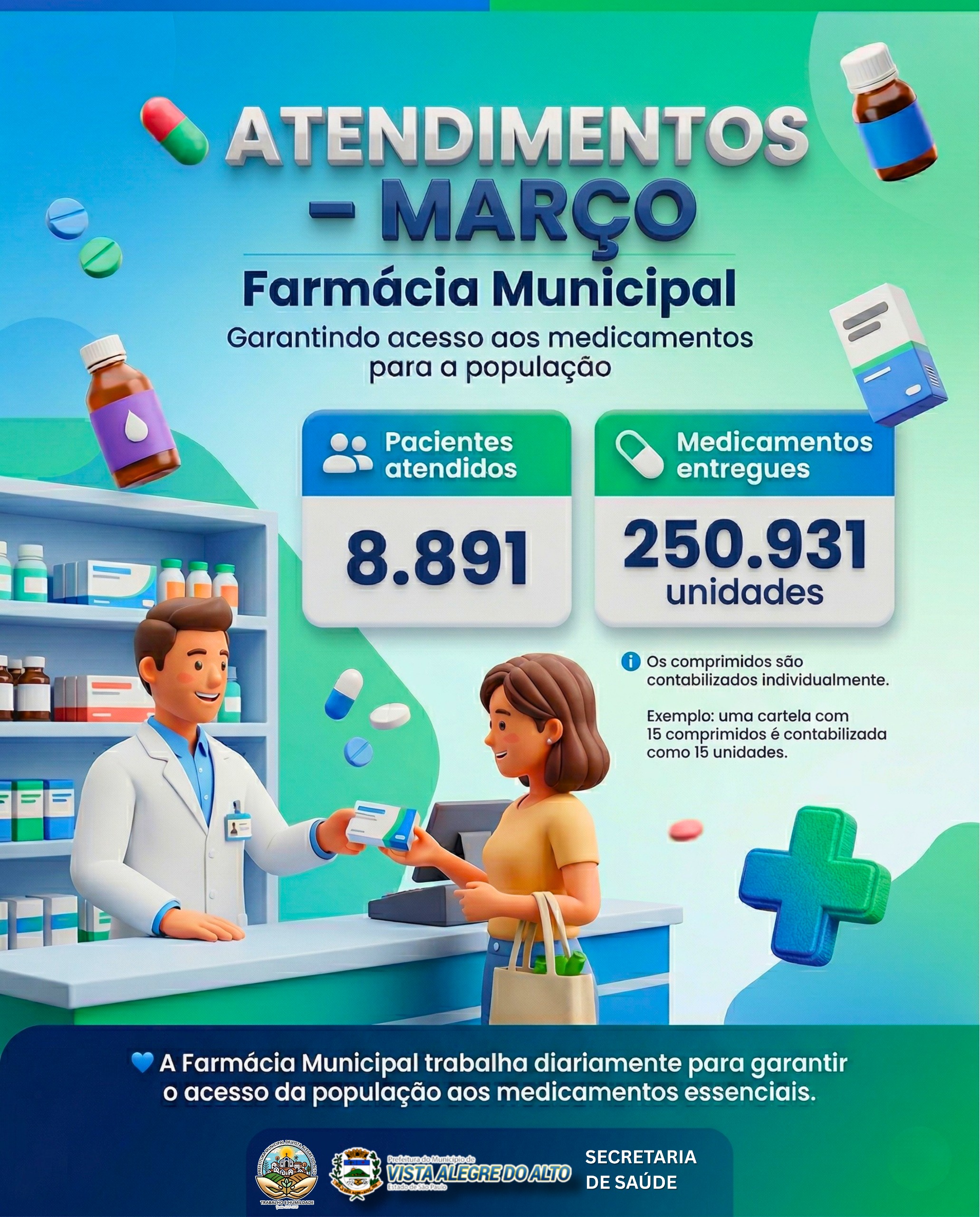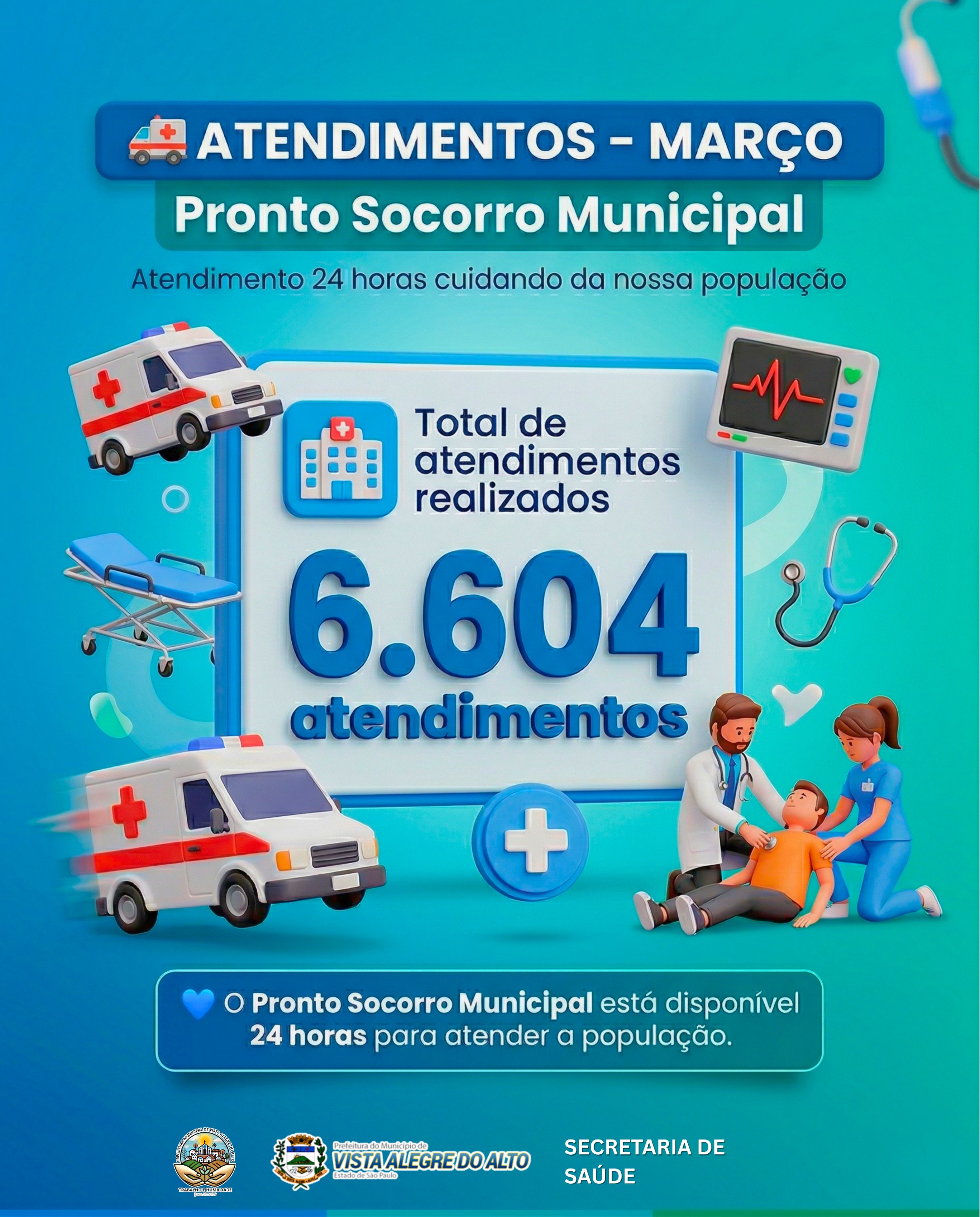 A Prefeitura de Vista Alegre do Alto, por meio da Secretaria Municipal de Saúde, segue trabalhando diariamente para garantir atendimento de qualidade à população. Os números de março demonstram o compromisso contínuo com o cuidado e o acesso aos serviços de saúde no município.