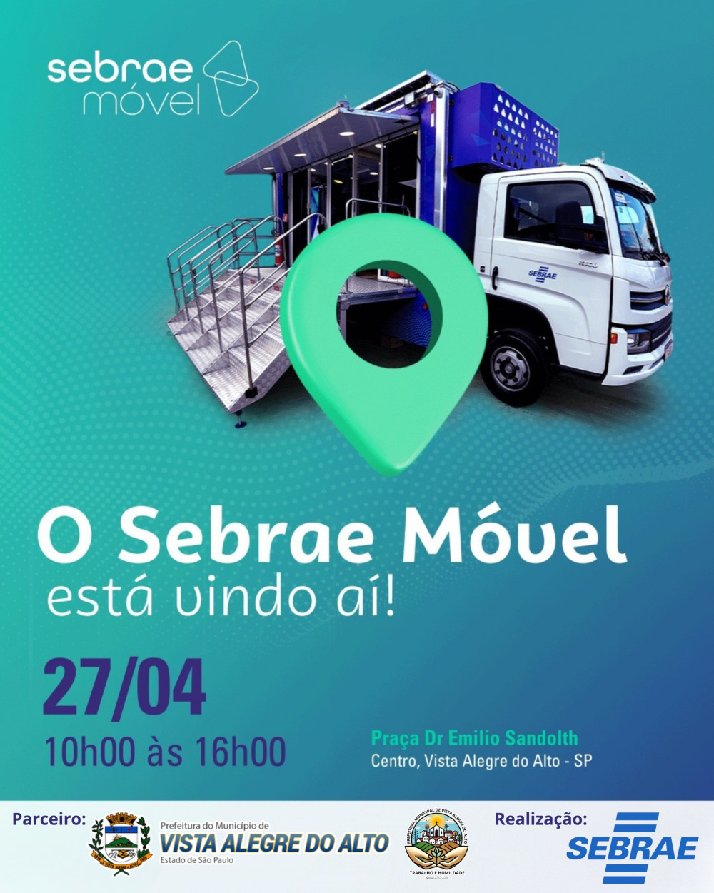O Sebrae Móvel estará em Vista Alegre do Alto no dia 27 de abril, das 10h às 16h, na Praça Dr. Emílio Sandolth.