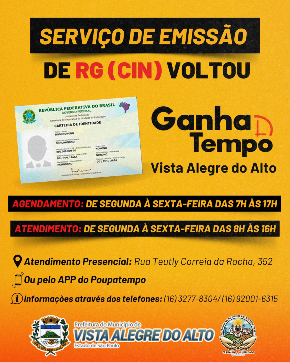 O serviço de emissão de RG voltou a ser realizado em Vista Alegre do Alto. A população já pode solicitar o documento presencialmente no Ganha Tempo da cidade, com atendimento de segunda a sexta-feira, das 8h às 16h.