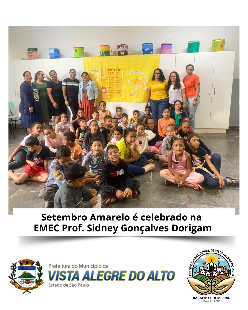 A Prefeitura de Vista Alegre do Alto, por meio da Secretaria Municipal de Educação, destaca a ação especial realizada pela EMEC Prof. Sidney Gonçalves Dorigam em alusão ao Setembro Amarelo, mês dedicado à valorização da vida e à promoção da saúde emocional.