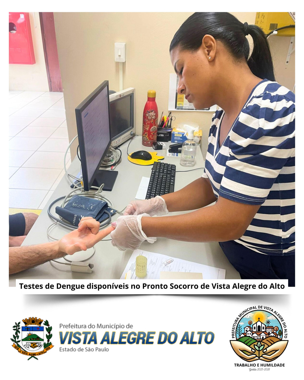 Hoje, o município de Vista Alegre do Alto deu um grande passo na área da saúde: foi realizado o primeiro teste de Dengue no município! Agora, os moradores podem realizar o teste rápido no Pronto Socorro, com resultados mais rápidos e precisos, graças a uma parceria com o Ministério da Saúde do estado de São Paulo.