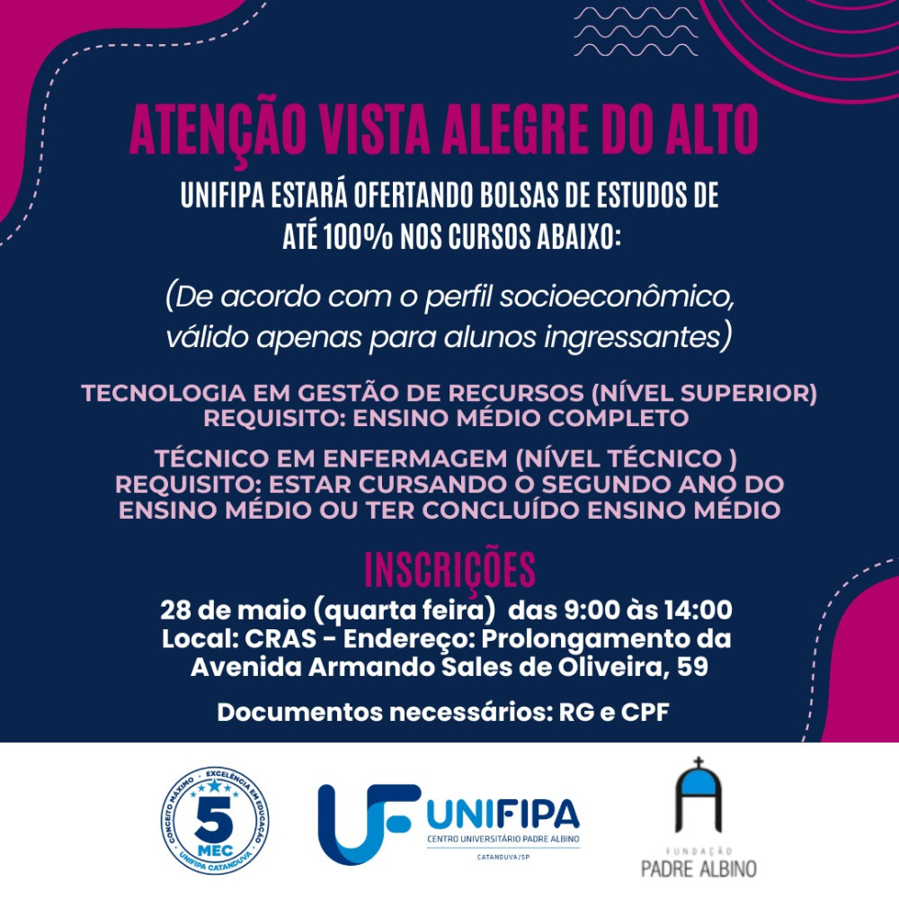 A população de Vista Alegre do Alto terá acesso a uma importante oportunidade educacional. A UNIFIPA (Centro Universitário Padre Albino) estará oferecendo bolsas de estudo de até 100% para cursos nas áreas de gestão e saúde, conforme o perfil socioeconômico dos candidatos. A ação é voltada exclusivamente para alunos ingressantes, com o objetivo de ampliar o acesso ao ensino técnico e superior.
