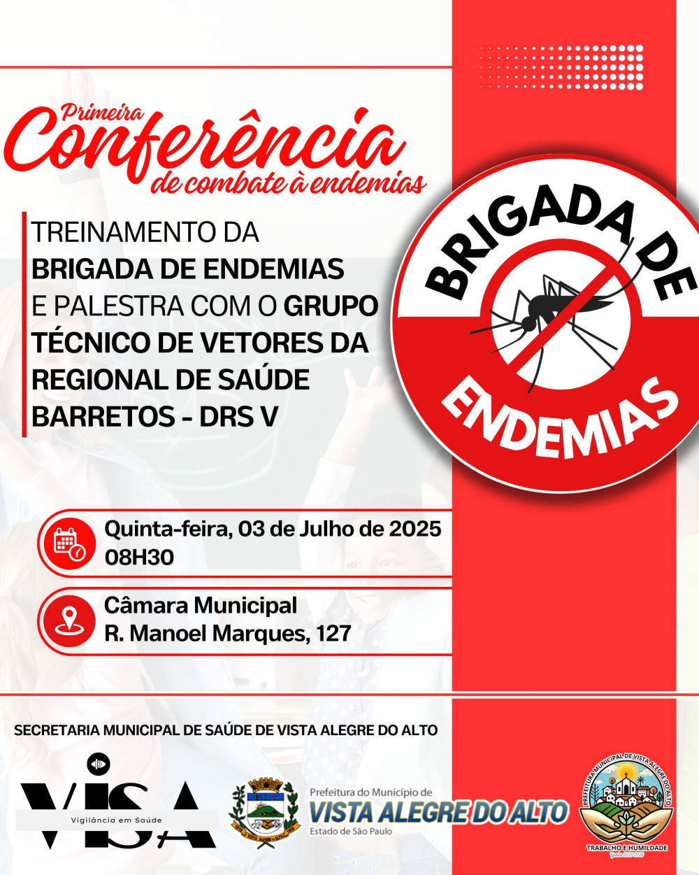 A Secretaria Municipal de Saúde, por meio da Vigilância em Saúde, convida todos os profissionais da área e interessados para participarem da Primeira Conferência de Combate às Endemias.