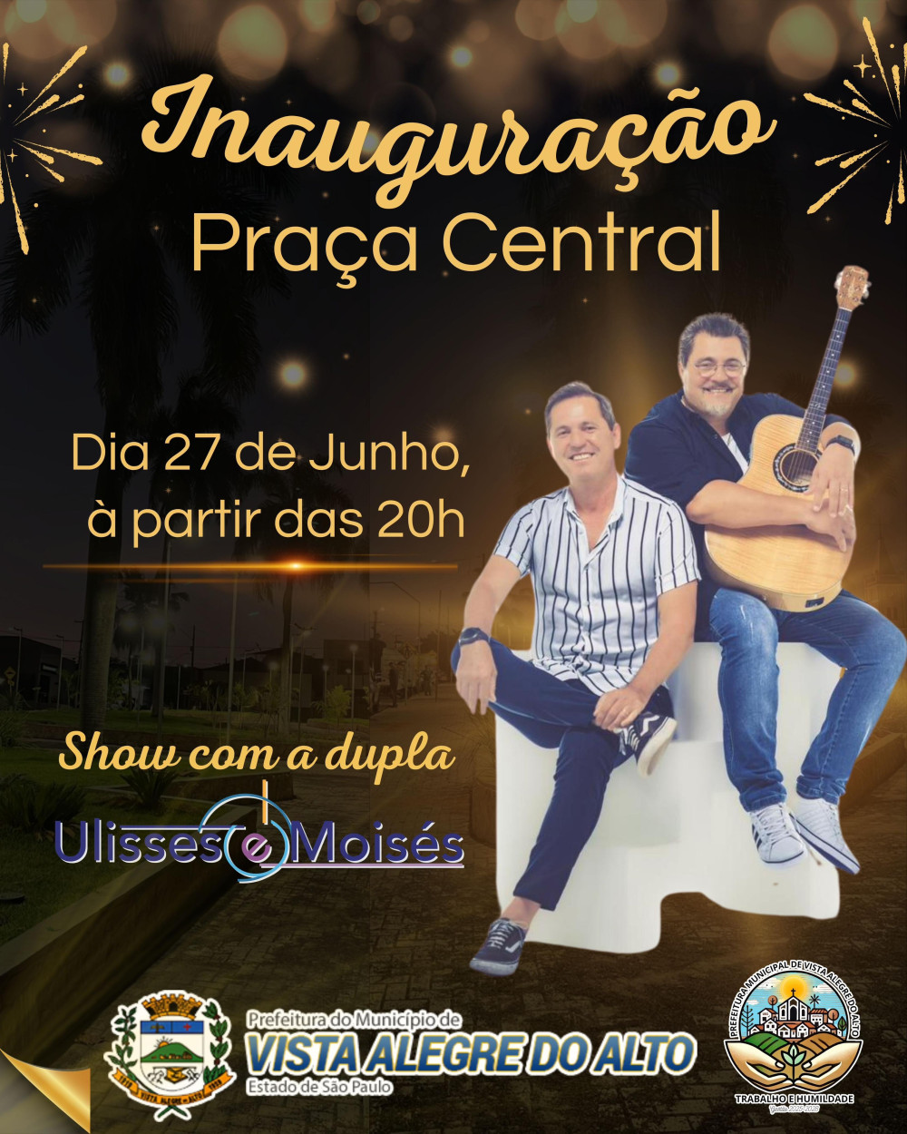 No dia 27 de junho, a partir das 20h, a nova Praça Central será inaugurada com show de Ulisses e Moisés.