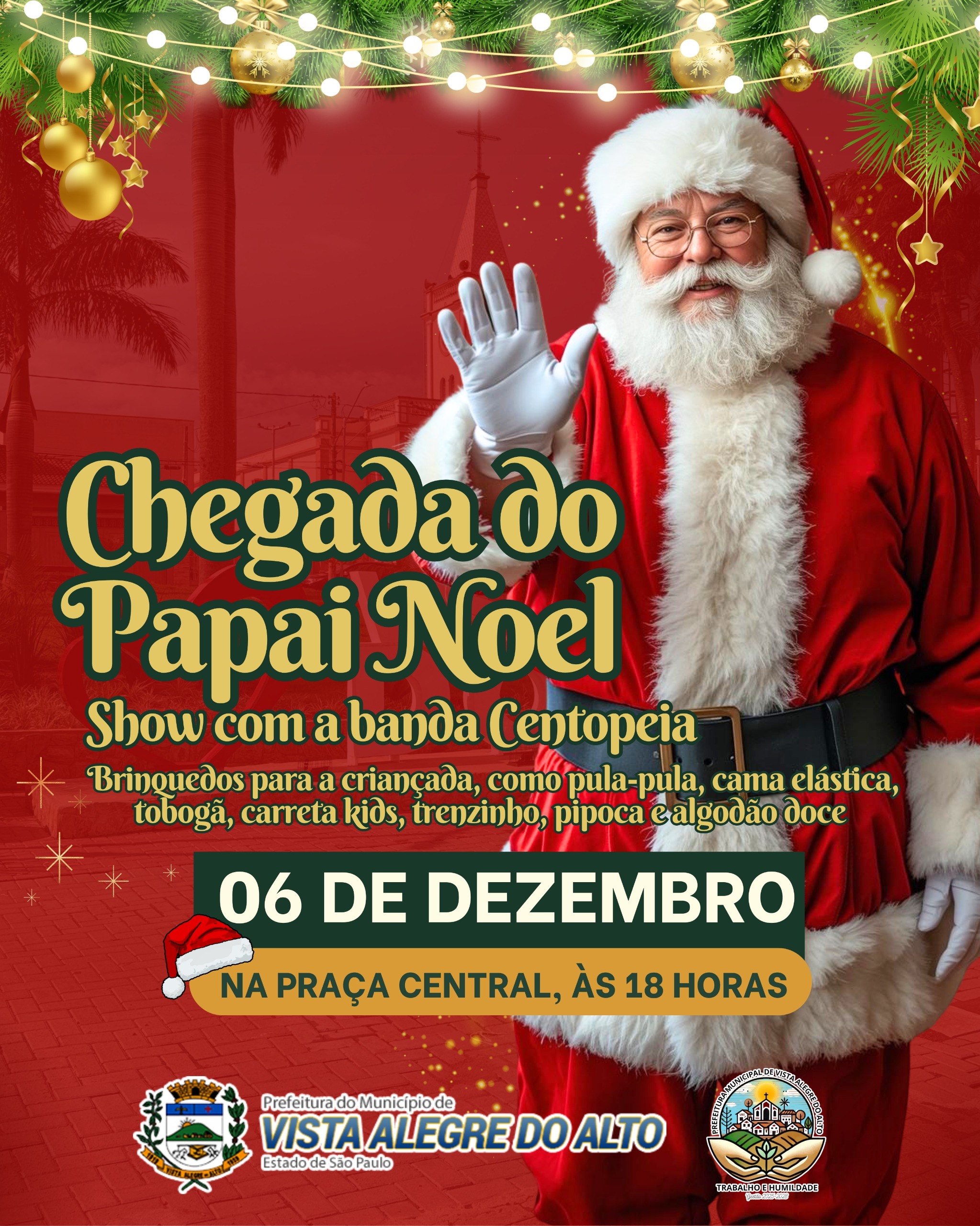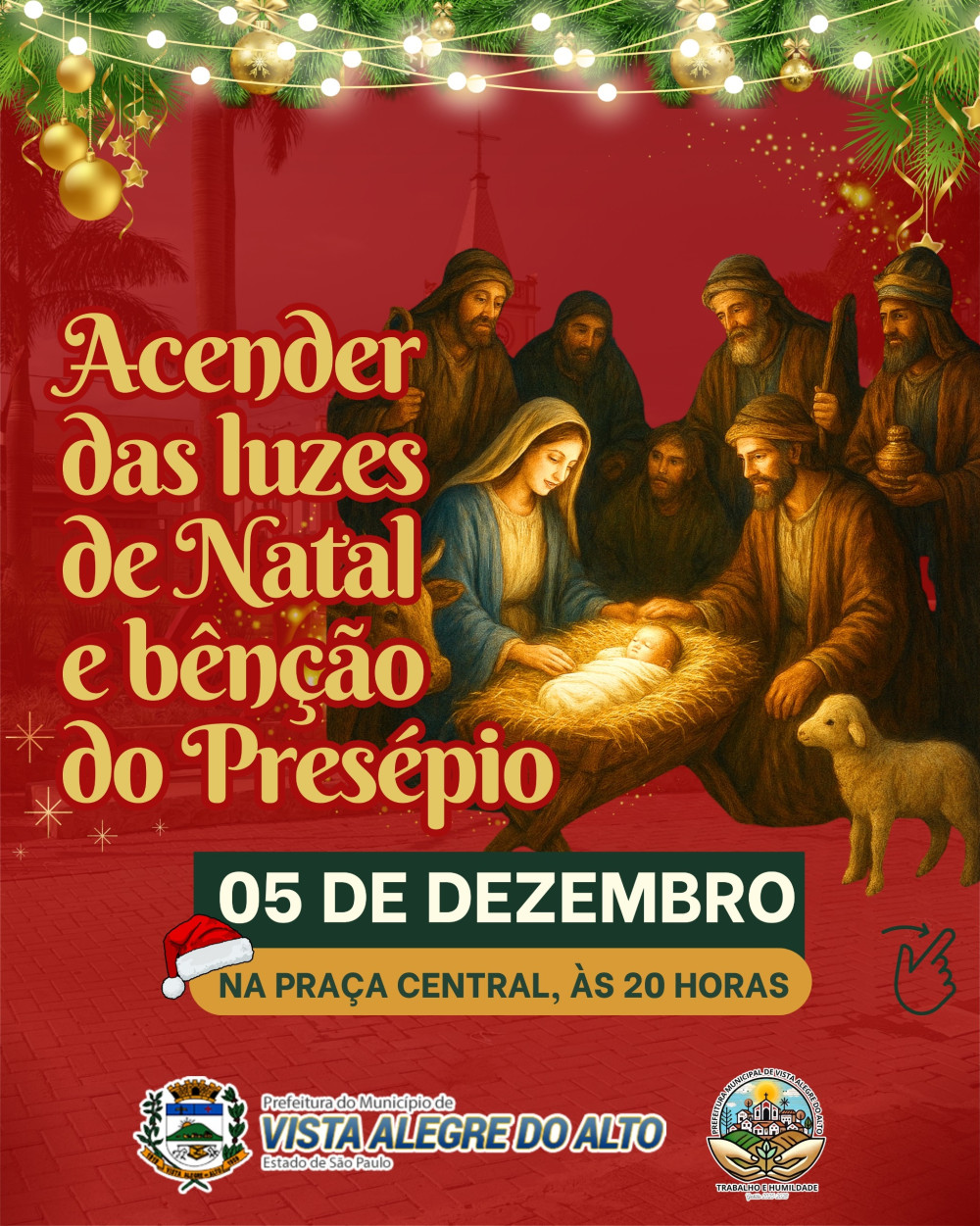 A Prefeitura de Vista Alegre do Alto convida todas as famílias para participar das comemorações especiais de fim de ano, que irão transformar a Praça Central em um cenário cheio de luz, encanto e alegria.