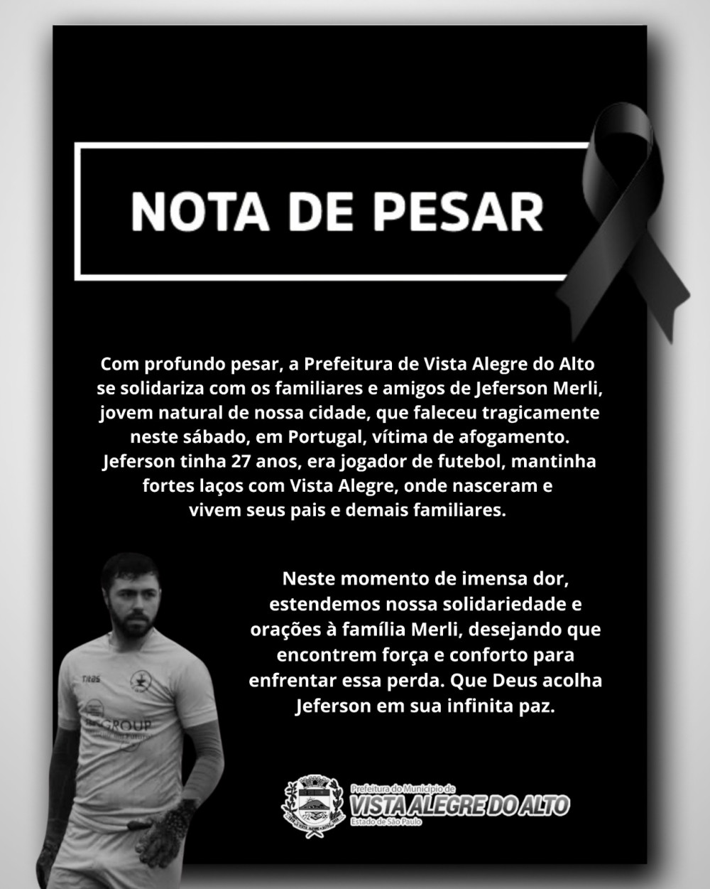 Recebemos com profunda tristeza a notícia do falecimento de Jeferson Merli, jovem de 27 anos, natural de nossa cidade, ocorrido neste sábado em Portugal, vítima de afogamento.
