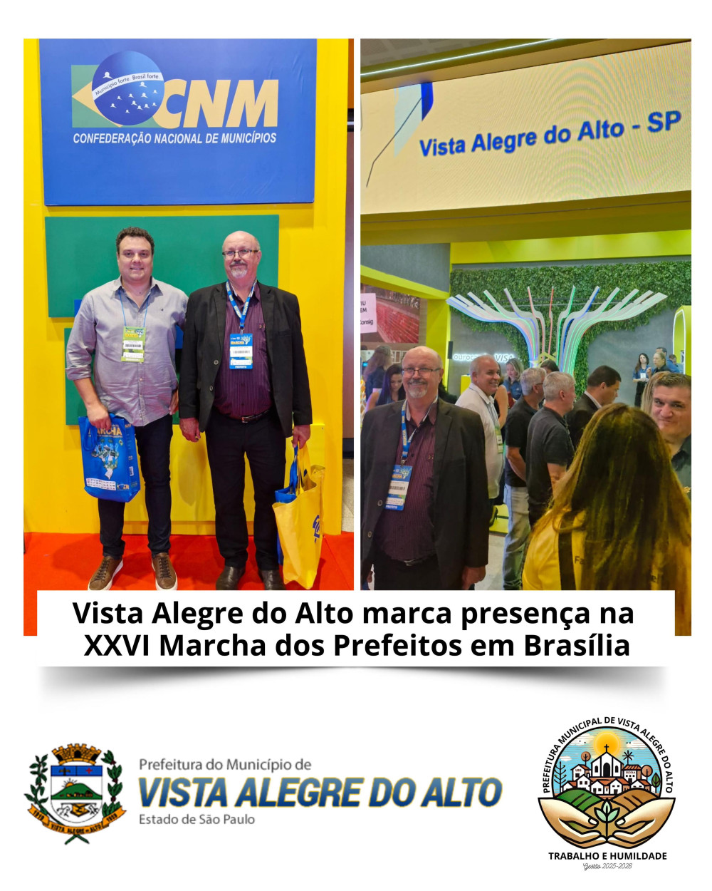Os representantes de Vista Alegre do Alto, Prefeito Nelsinho Rozani e o Presidente da Câmara Municipal, Marcelo Grassetti, estiveram em Brasília participando da XXVI Marcha dos Prefeitos e Vereadores. O evento, promovido pela Confederação Nacional de Municípios (CNM), é o maior encontro municipalista da América Latina, reunindo líderes municipais de todo o país.