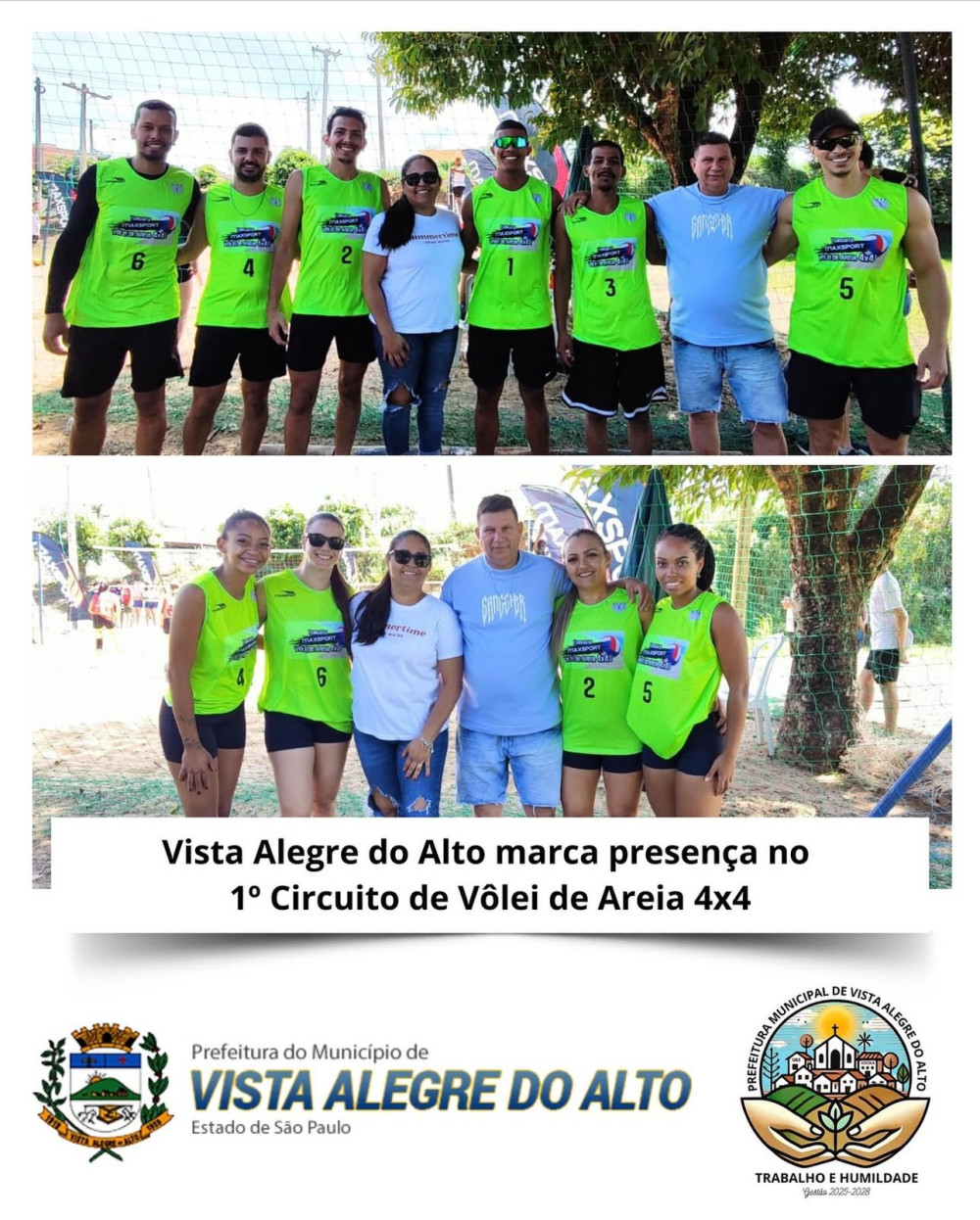 No último fim de semana, atletas de Vista Alegre do Alto participaram da primeira etapa do 1º Circuito de Vôlei de Areia 4x4 – masculino e feminino, realizada na cidade de Pirangi. Embora nossos times não tenham conquistado as melhores colocações nesta fase, a garra, o espírito esportivo e a dedicação dos competidores foram destaque!