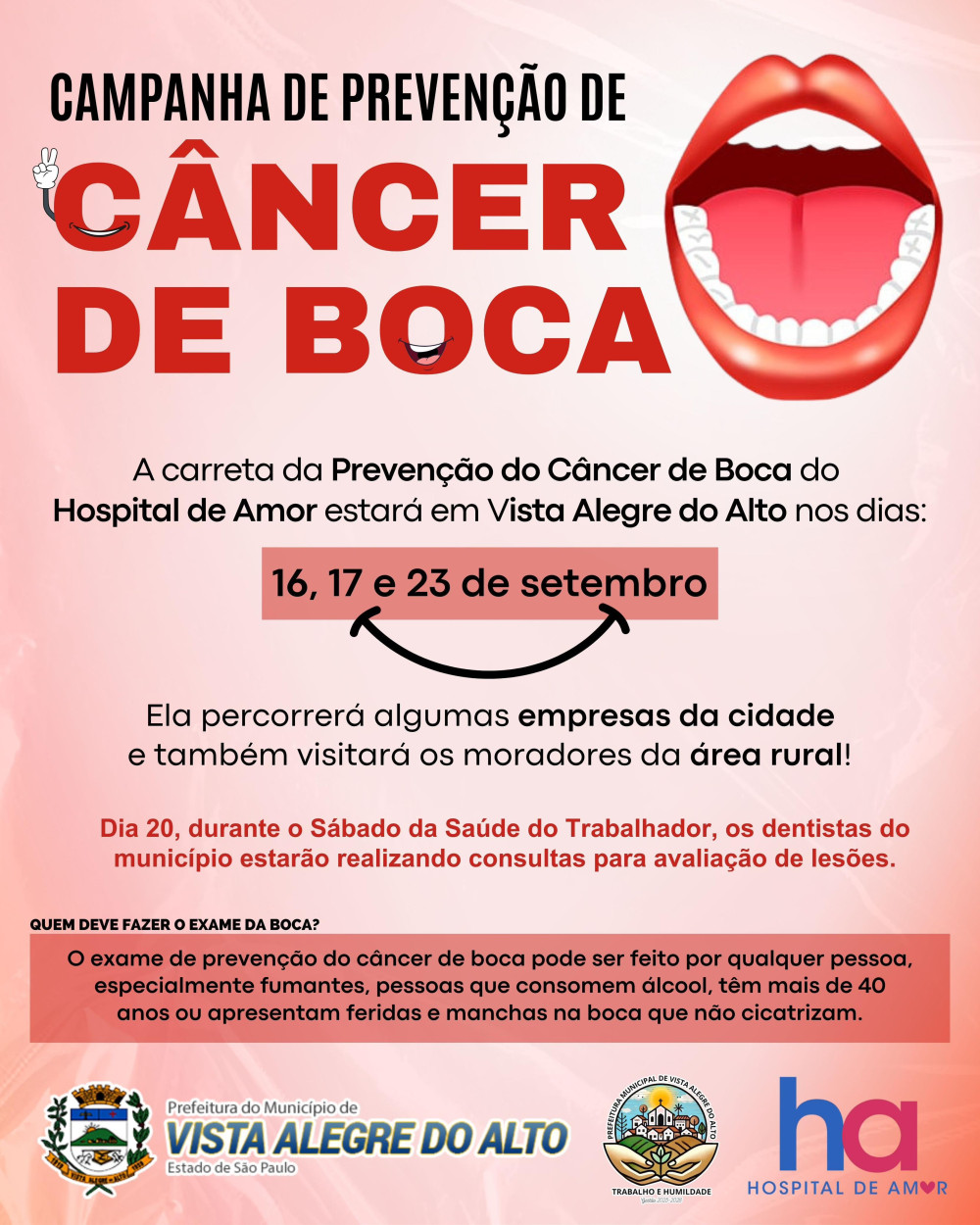 A Prefeitura de Vista Alegre do Alto, em parceria com o Hospital de Amor de Barretos, promove neste mês uma importante campanha de prevenção ao câncer de boca.