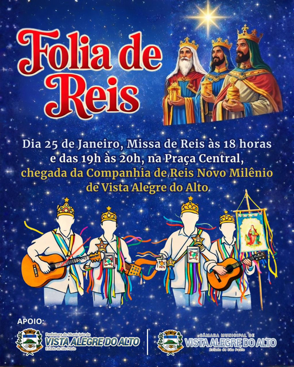 Vista Alegre do Alto será palco, no domingo, dia 25 de janeiro, da tradicional Folia de Reis, uma das mais importantes manifestações culturais e religiosas do município. O evento acontece na Praça Central e conta com o apoio da Prefeitura e da Câmara Municipal de Vista Alegre do Alto, reunindo fé, cultura e tradição.