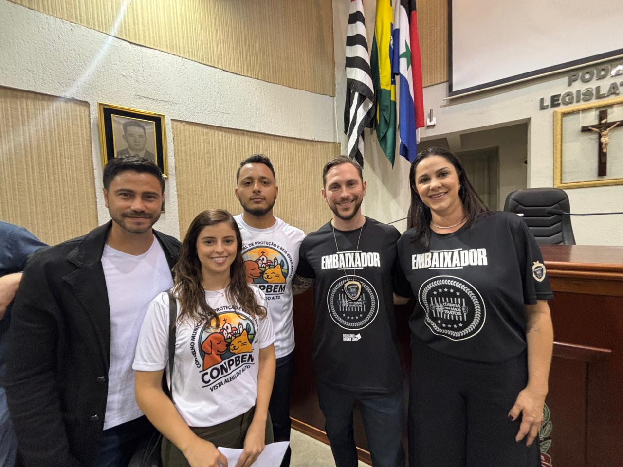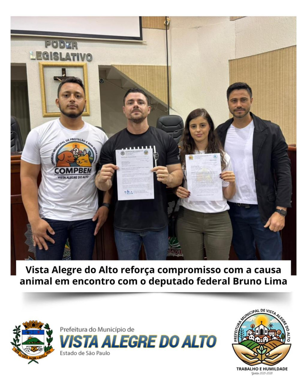 A Prefeitura de Vista Alegre do Alto, representada pelo Diretor de Vigilância em Saúde e presidente do Conselho Municipal de Proteção e Bem-Estar Animal (COMPBEM), Bruno Barbosa, participou de um importante encontro em Monte Alto, durante moção de agradecimento da vereadora Simone Defini ao deputado federal Bruno Lima e ao delegado Dr. Marcelo Lourenço, ambos reconhecidos defensores da causa animal e da segurança pública.