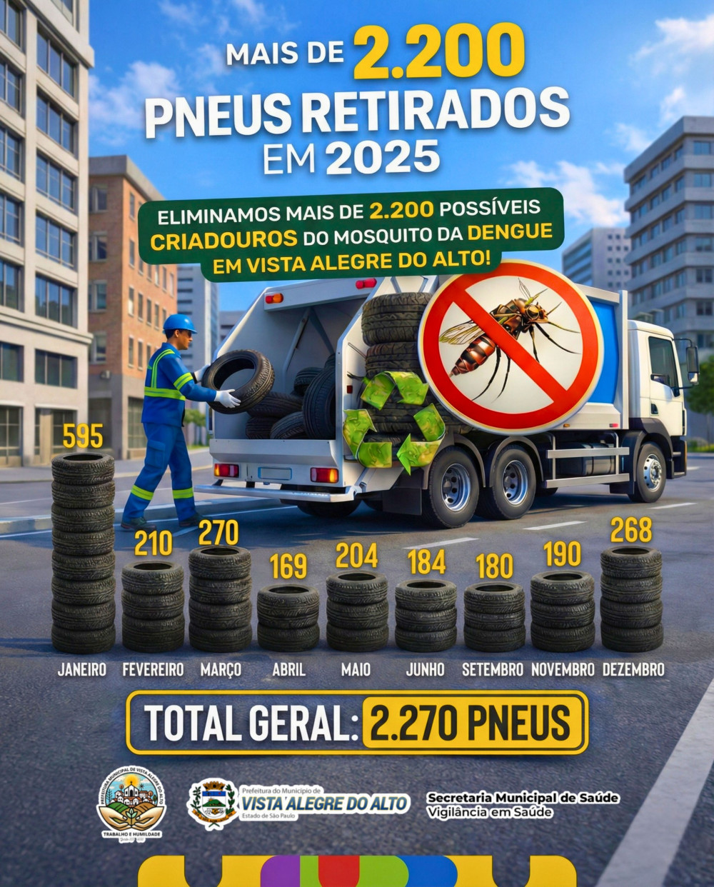 Ao longo de 2025, a Prefeitura de Vista Alegre do Alto intensificou as ações de combate ao mosquito Aedes aegypti por meio da retirada de pneus descartados de forma irregular no município. No total, 2.270 pneus foram recolhidos, eliminando mais de 2.200 potenciais criadouros do mosquito transmissor da dengue, zika e chikungunya.