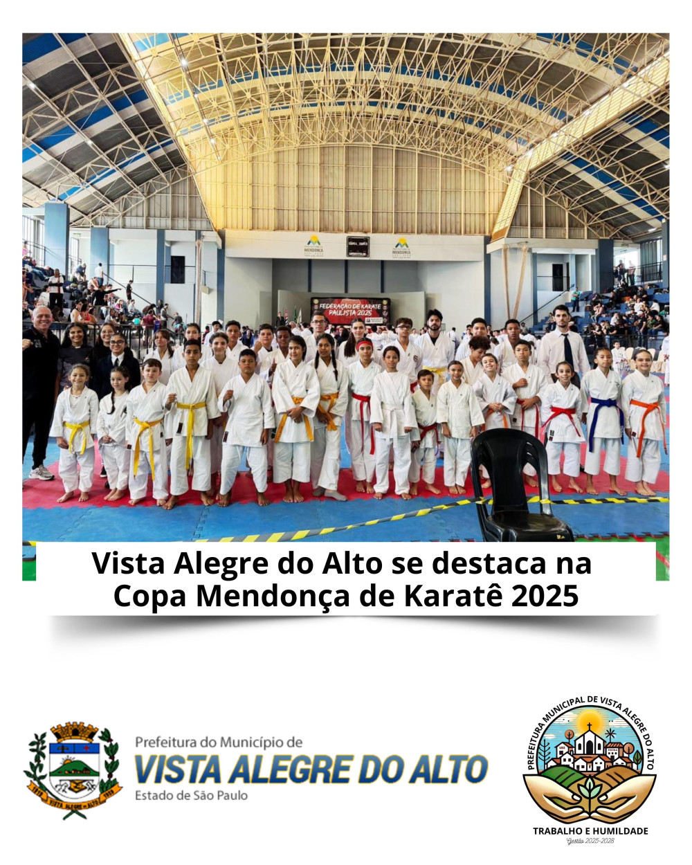 Atletas de Vista Alegre do Alto brilharam na Copa Mendonça de Karatê 2025, realizada no Ginásio de Esportes Mário Covas, na cidade de Mendonça. A competição, promovida pela Federação de Karatê Paulista (FKP), contou pontos para o ranking estadual da temporada 2025/2026 e reuniu competidores de diversas cidades do Estado de São Paulo.