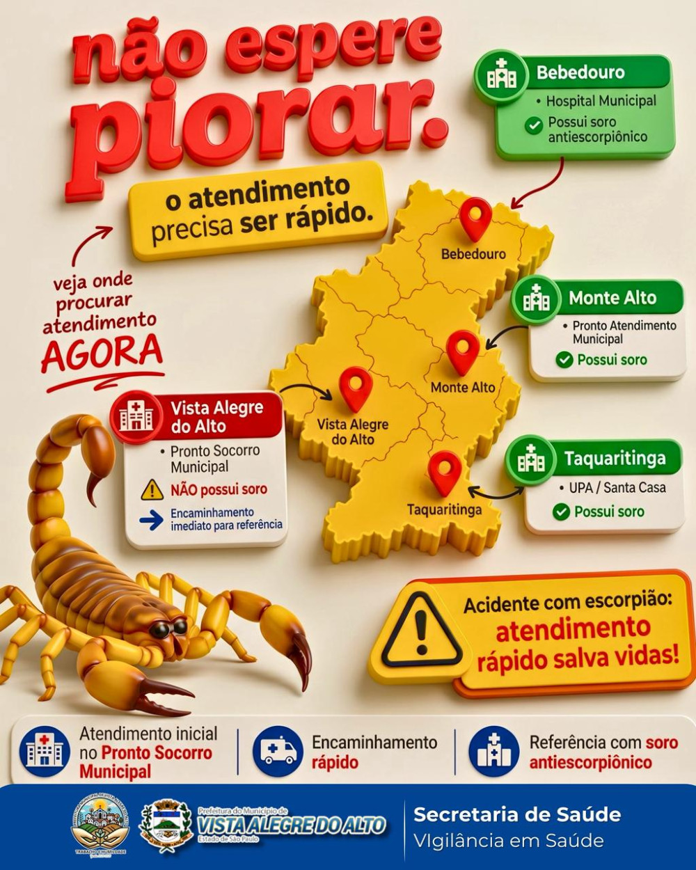 27/04/2026 - Saúde reforça importância de atendimento imediato em acidentes com escorpião.