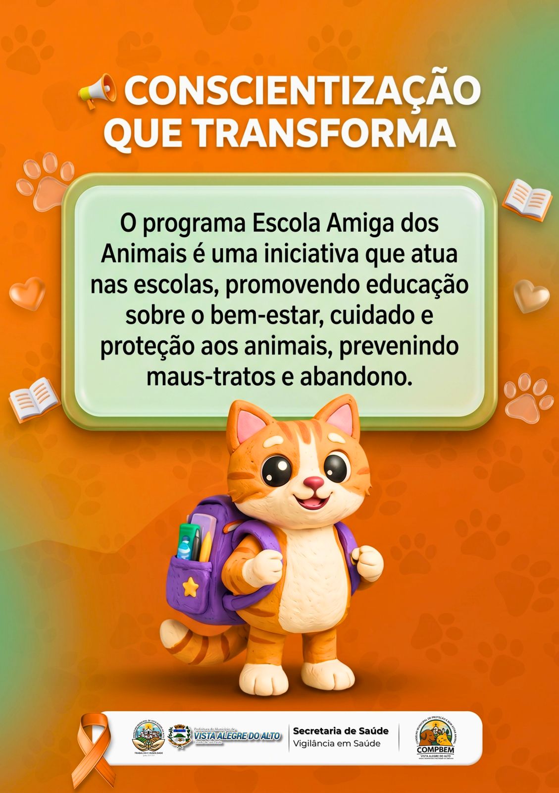 Durante o mês de abril, marcado pela campanha Abril Laranja, o município de Vista Alegre do Alto intensifica as ações de conscientização sobre a prevenção aos maus-tratos e a importância do cuidado com os animais.