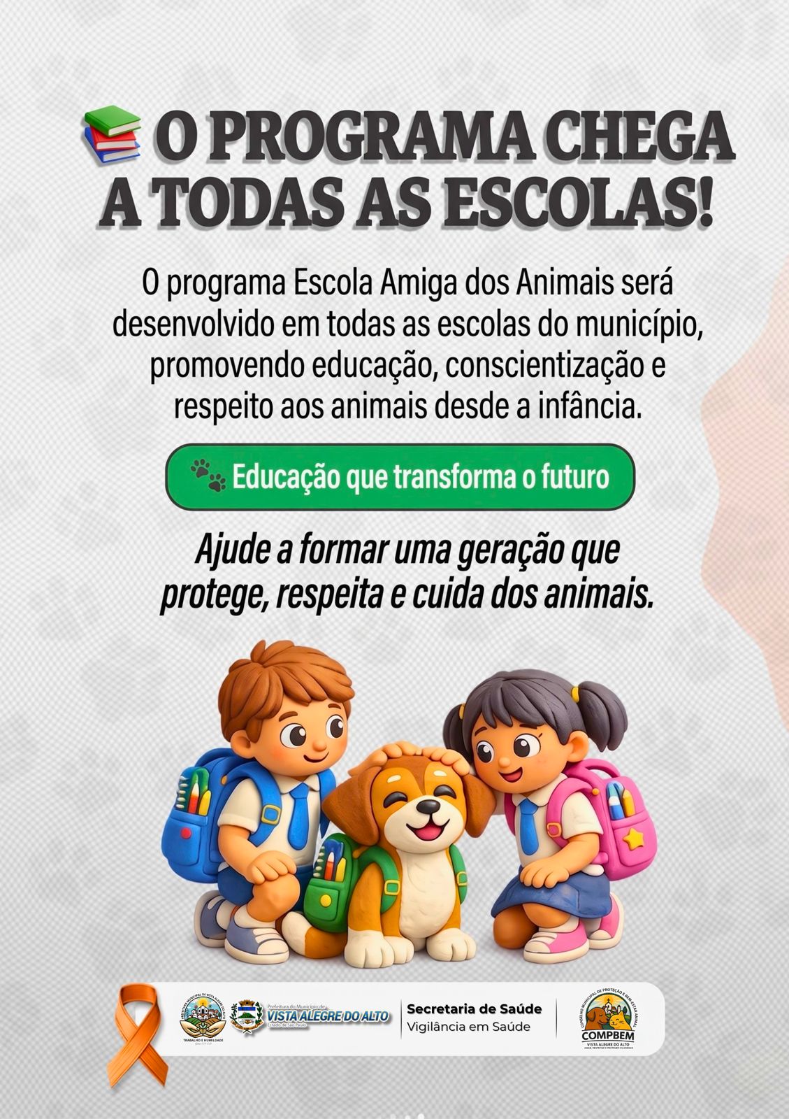 Na próxima semana, uma ação especial será realizada nas unidades escolares do município. Durante as atividades, os alunos participarão de orientações sobre maus-tratos, cuidados adequados e a importância da proteção animal, de forma educativa e acessível.