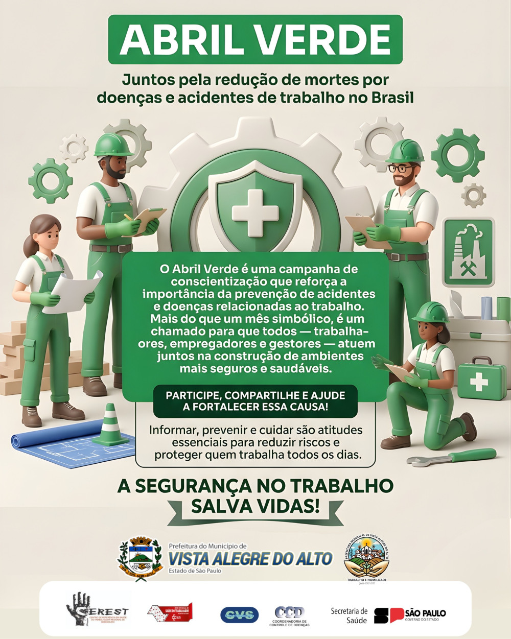 A Prefeitura de Vista Alegre do Alto reforça seu compromisso com a saúde e a segurança dos trabalhadores ao apoiar a campanha Abril Verde, um movimento nacional de conscientização voltado à prevenção de acidentes e doenças relacionadas ao trabalho.