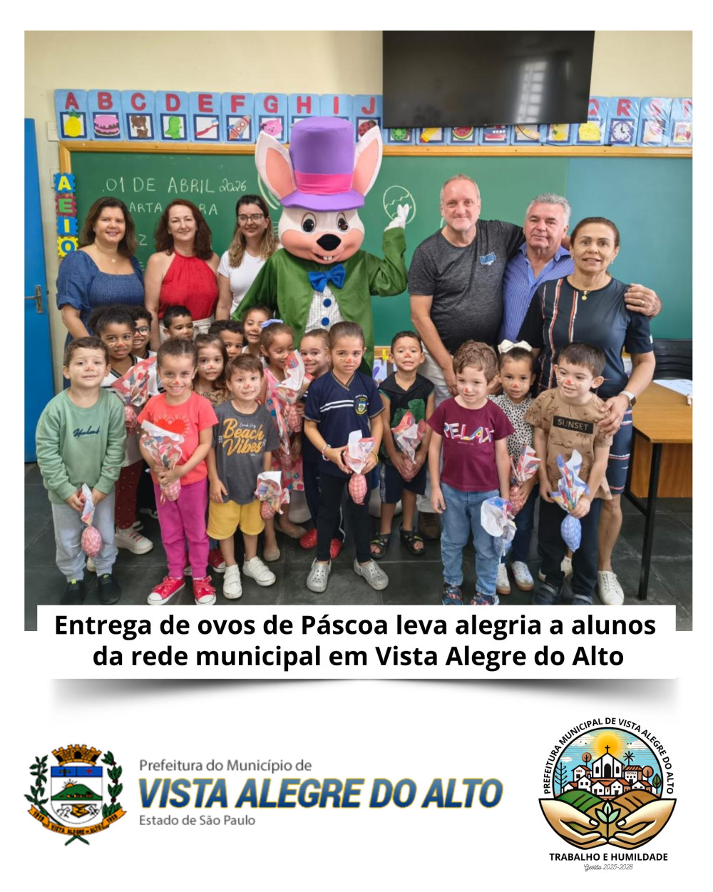 Nesta quarta-feira, a Prefeitura de Vista Alegre do Alto realizou a entrega de ovos de Páscoa para os alunos da rede municipal de ensino, proporcionando um momento especial e cheio de alegria para as crianças.