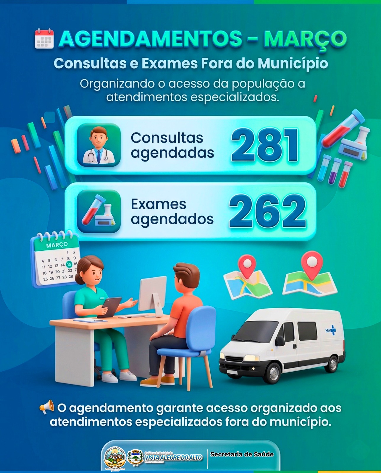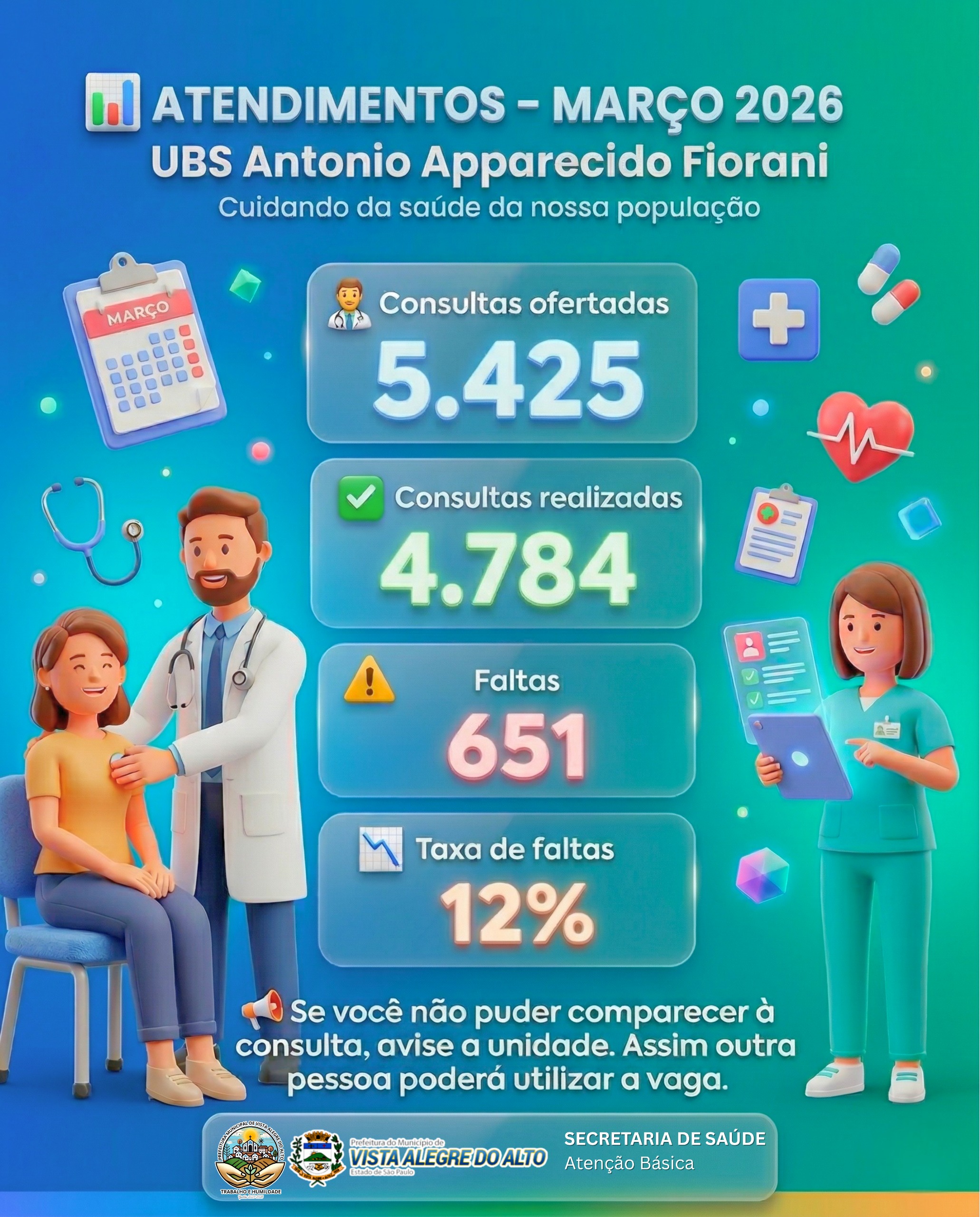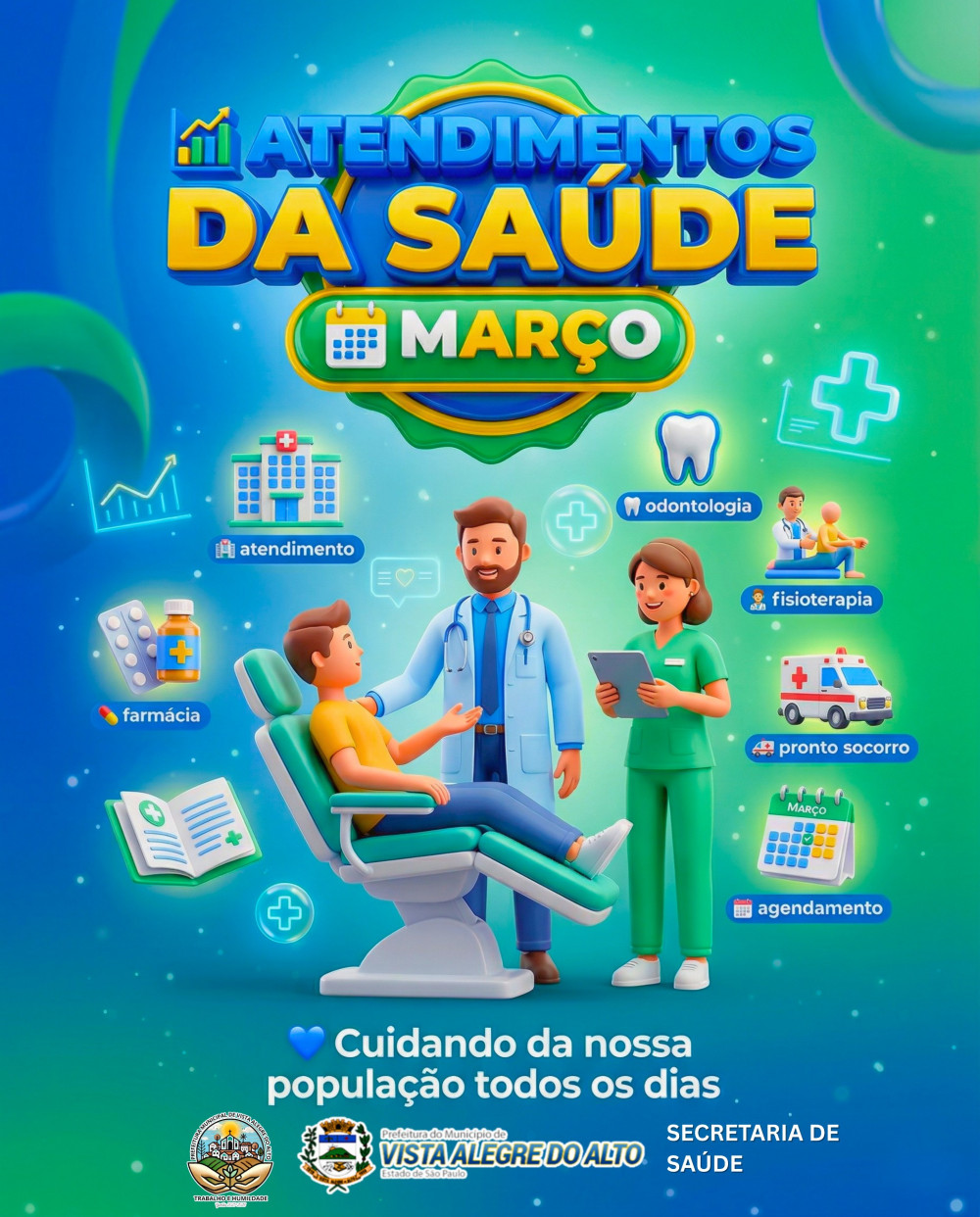 A Prefeitura de Vista Alegre do Alto, por meio da Secretaria Municipal de Saúde, segue trabalhando diariamente para garantir atendimento de qualidade à população. Os números de março demonstram o compromisso contínuo com o cuidado e o acesso aos serviços de saúde no município.