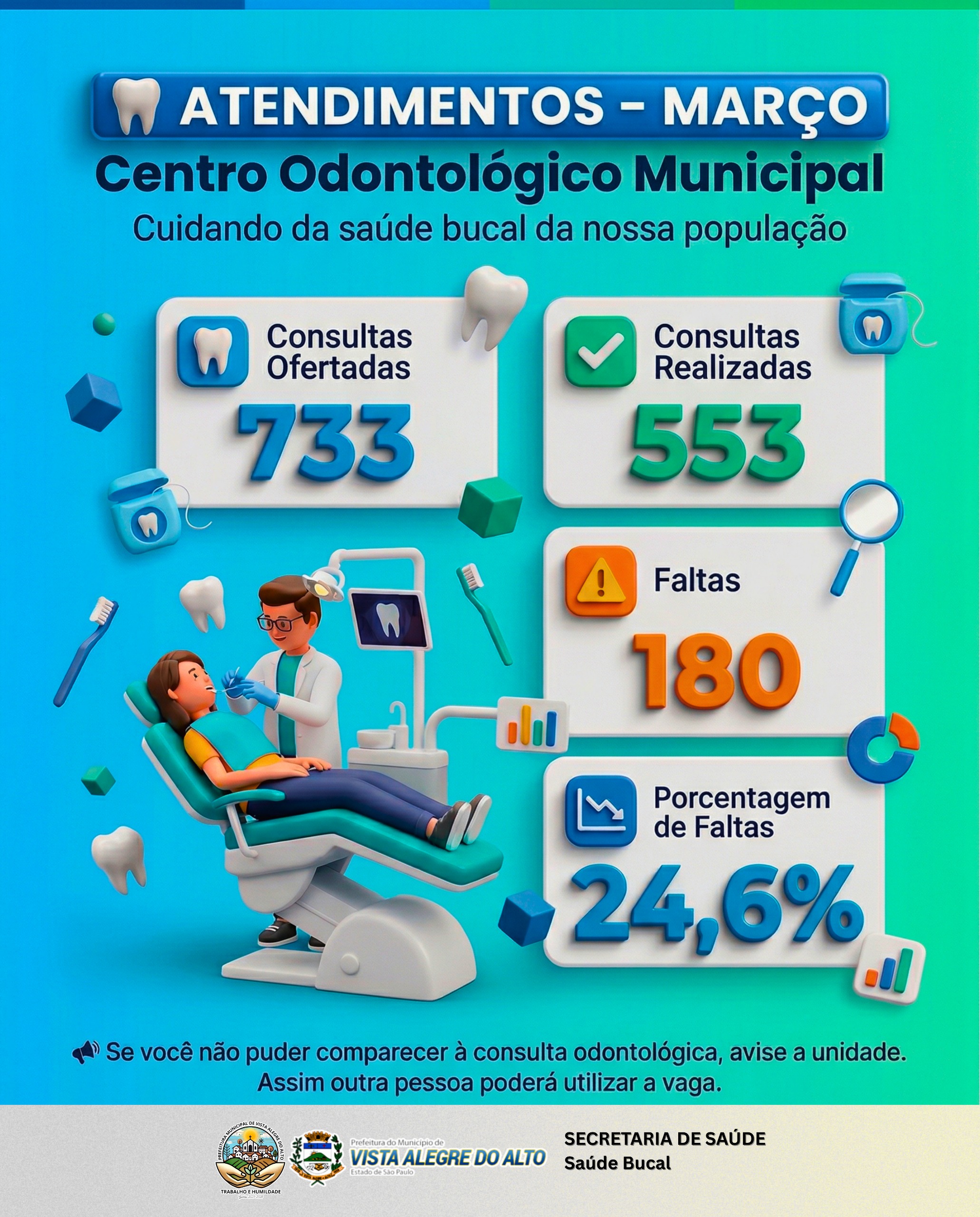 No Centro Odontológico Municipal, foram ofertadas 733 consultas, com 553 atendimentos realizados. Ainda assim, foram registradas 180 faltas, resultando em uma taxa de ausência de 24,6%, um alerta para a importância do comparecimento.